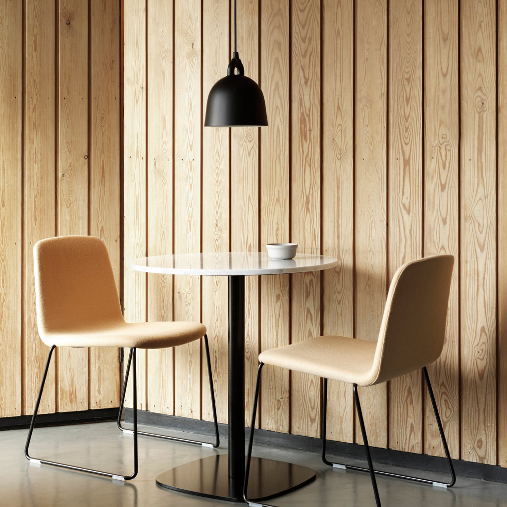The designers Andreas Lund and Jacob Rudbeck have taken their starting point for the design in the iconic shape of a bell. The lamp’s rounded silhouette and matt surface give it the impression of having been cast. The white inner side reflects the light, which falls like a cone and provides practical lighting for several purposes.