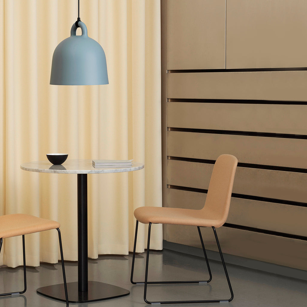 The designers Andreas Lund and Jacob Rudbeck have taken their starting point for the design in the iconic shape of a bell. The lamp’s rounded silhouette and matt surface give it the impression of having been cast. The white inner side reflects the light, which falls like a cone and provides practical lighting for several purposes.
