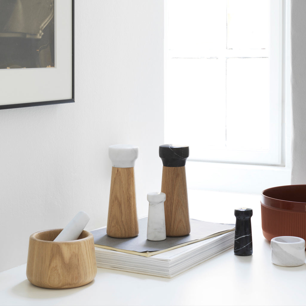 The Craft Mills are sold separately and look beautiful in the kitchen as well as being a decorative addition to the dining table. The dark and light marble knobs elegantly underline the simple function of the mills.