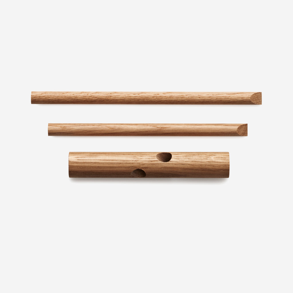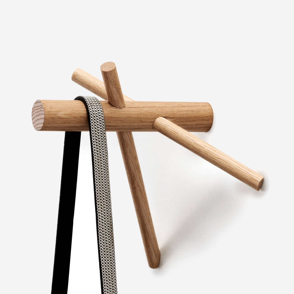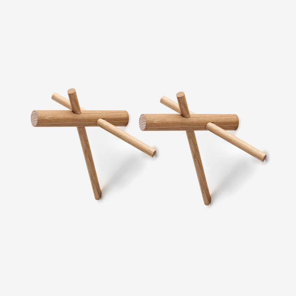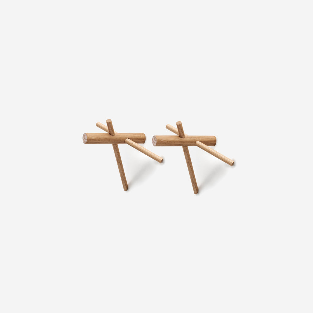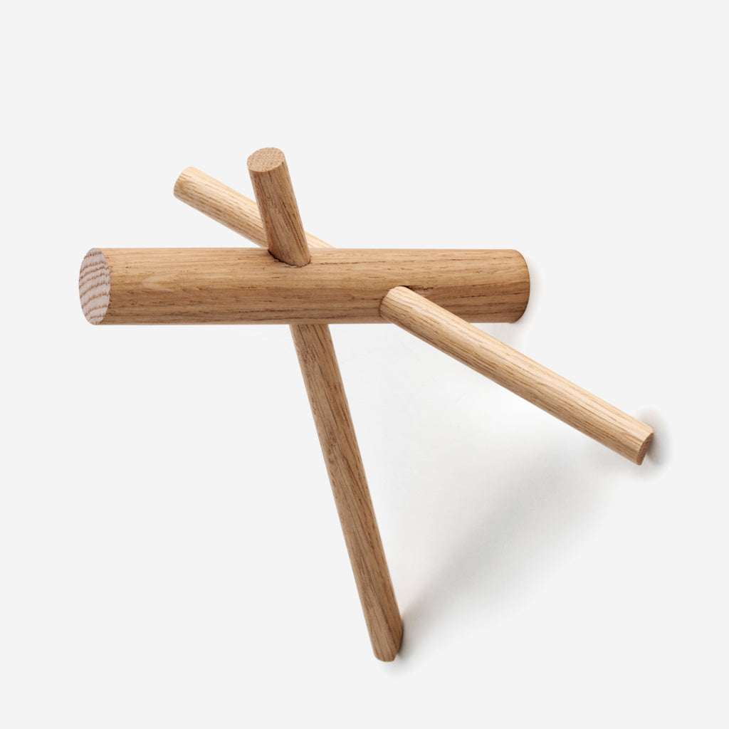 Sticks is a simple and solid hook designed by the Belgian designer Benoît Deneufbourg. The simple construction made of three sticks creates a functional and decorative hook providing various options for hanging clothes. Use the Sticks hooks for tea towels in the kitchen, in the hall for coats and jackets or in the bedroom to hang bags on.