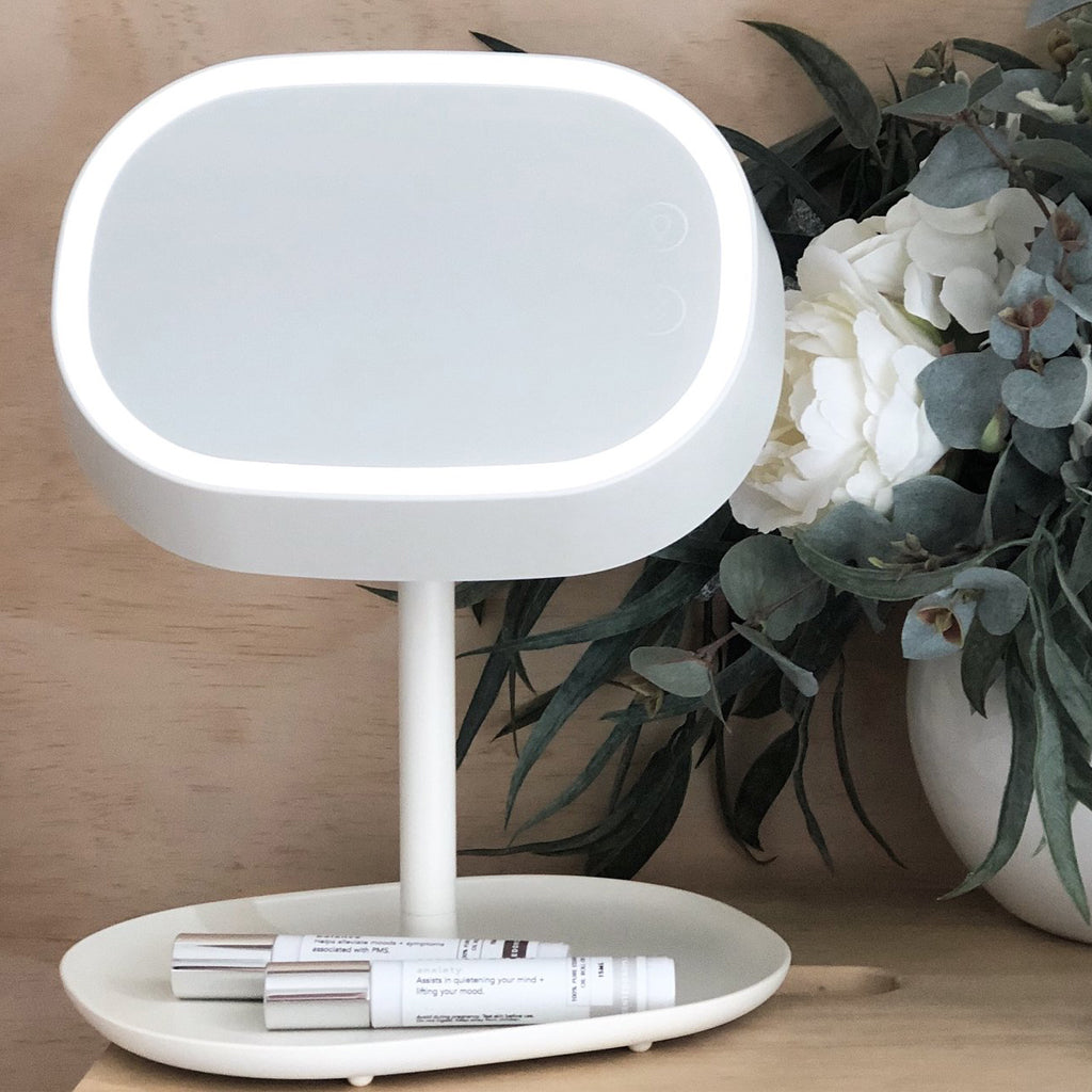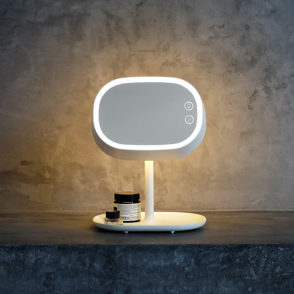 A smart rechargeable mirror that serves dual functions as a lamp and mirror just by the tilt of its head. Touch sensors allow you turn the light on and off as well as adjust the brightness of the light.
