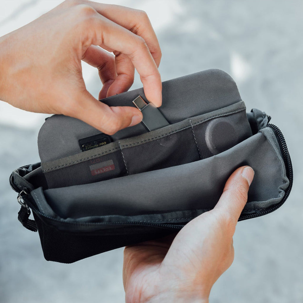 Lounge around on the job? Not this pouch. Its efficient self-standing design means that it remains upright and stable when placed on flat surfaces, so you get maximum storage capacity with minimum footprint. An expandable base means there is plenty of space to fit your essentials in. Light load? The desk pouch is compact when empty and easy to store in your bag. No more digging around in the depths of your pouch to find small items. The integrated fold-down panel makes it easy to find exactly what you’re looking for (and fast).