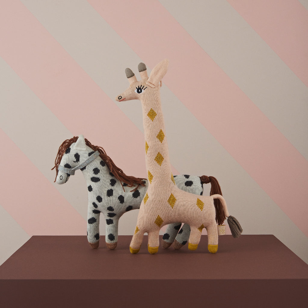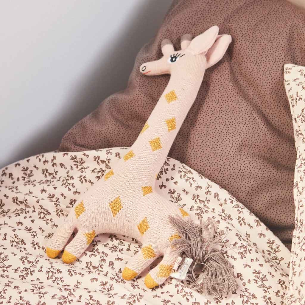 The Guggi Giraffe has a cute and playful look in rose and amber colours, making it adorable to look at and comfortable to cuddle with. Made of 100% cotton knit with a soft fibre filling.