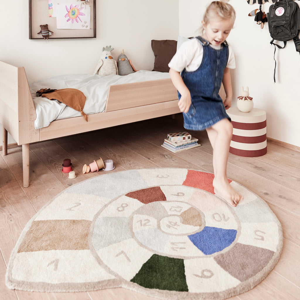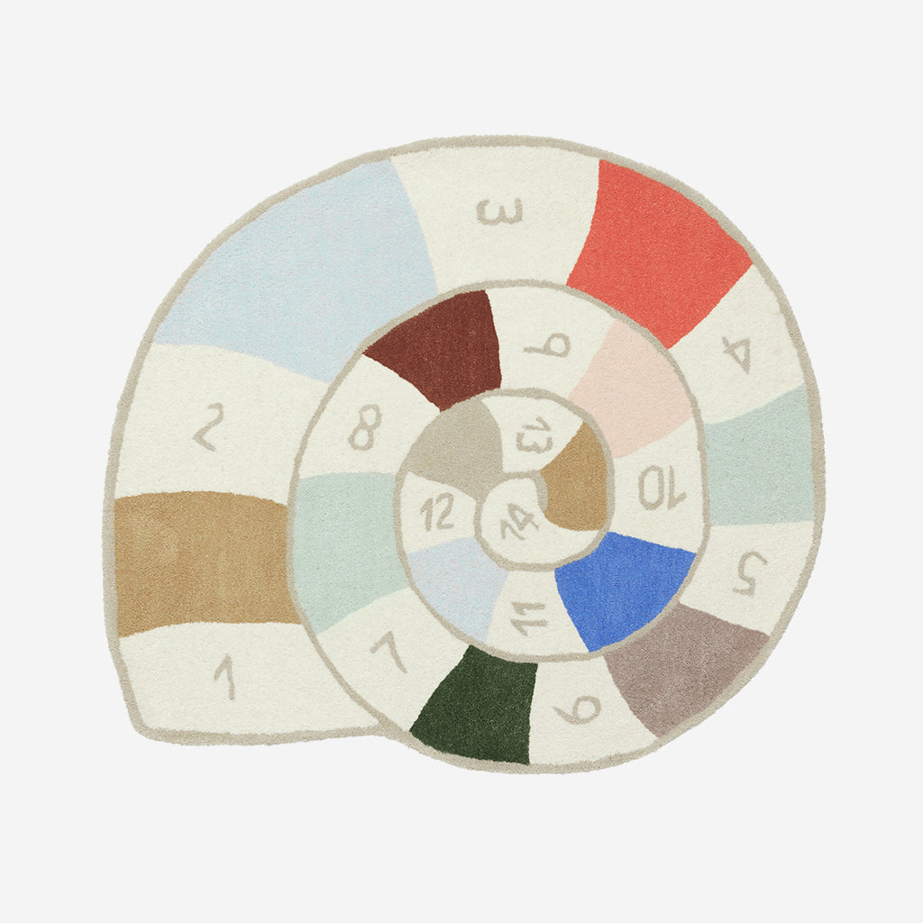 The Nautilus hopscotch rug is a cozy addition to keep little feet warm and provide hours of playful fun on the floor. Crafted with the same tufted quality as the beloved Lion Rug and Koala Rug, this new variant is made from a blend of 80% wool and 20% cotton. Hand-tufted for a soft touch, it is recommended to maintain its charm with regular vacuuming and spot cleaning.