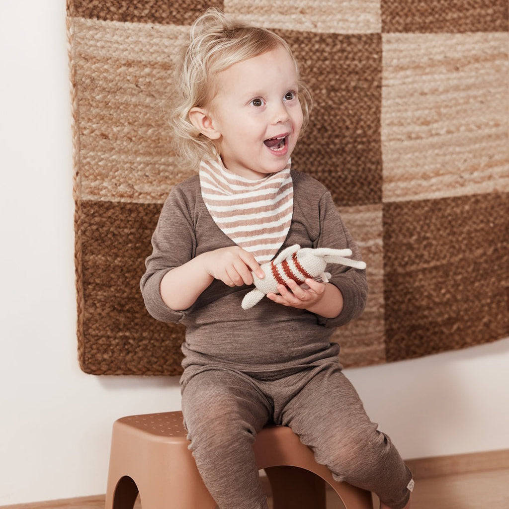 The Rabbit Step Stool is both functional and whimsical. Crafted from durable bamboo fiber, this step stool can support a maximum weight of 100kg. Featuring an anti-slip surface adorned with small rabbit heads, a signature from the OYOY Mini logo, it ensures safety with a touch of charm. The practical hole in the middle facilitates easy movement for both kids and adults. Versatile and stackable, this stool can be used in all rooms. Don't forget the friendly reminder: Do not jump! Rubber feet provide stability, making the Rabbit Step Stool a delightful and practical accent for your home.
