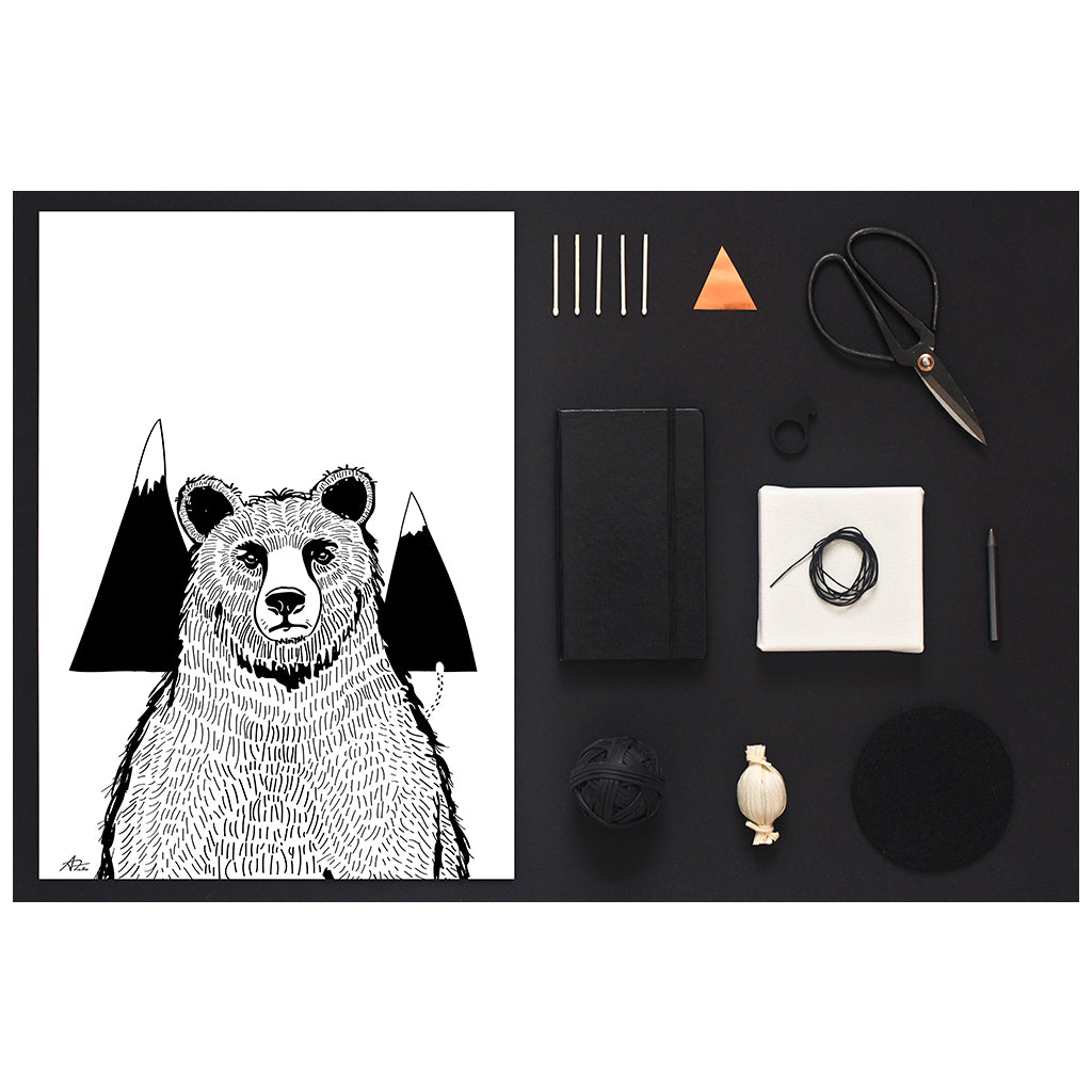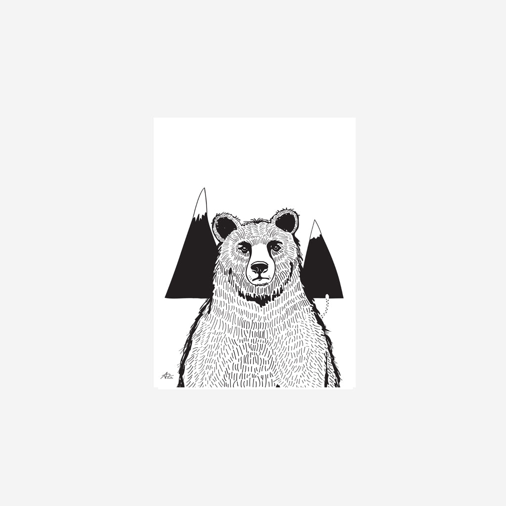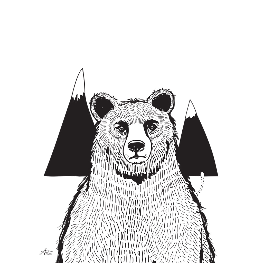 Line drawing of a bear in the Mountains. Perfect for any child's room with its neutral monochromatic palette.
