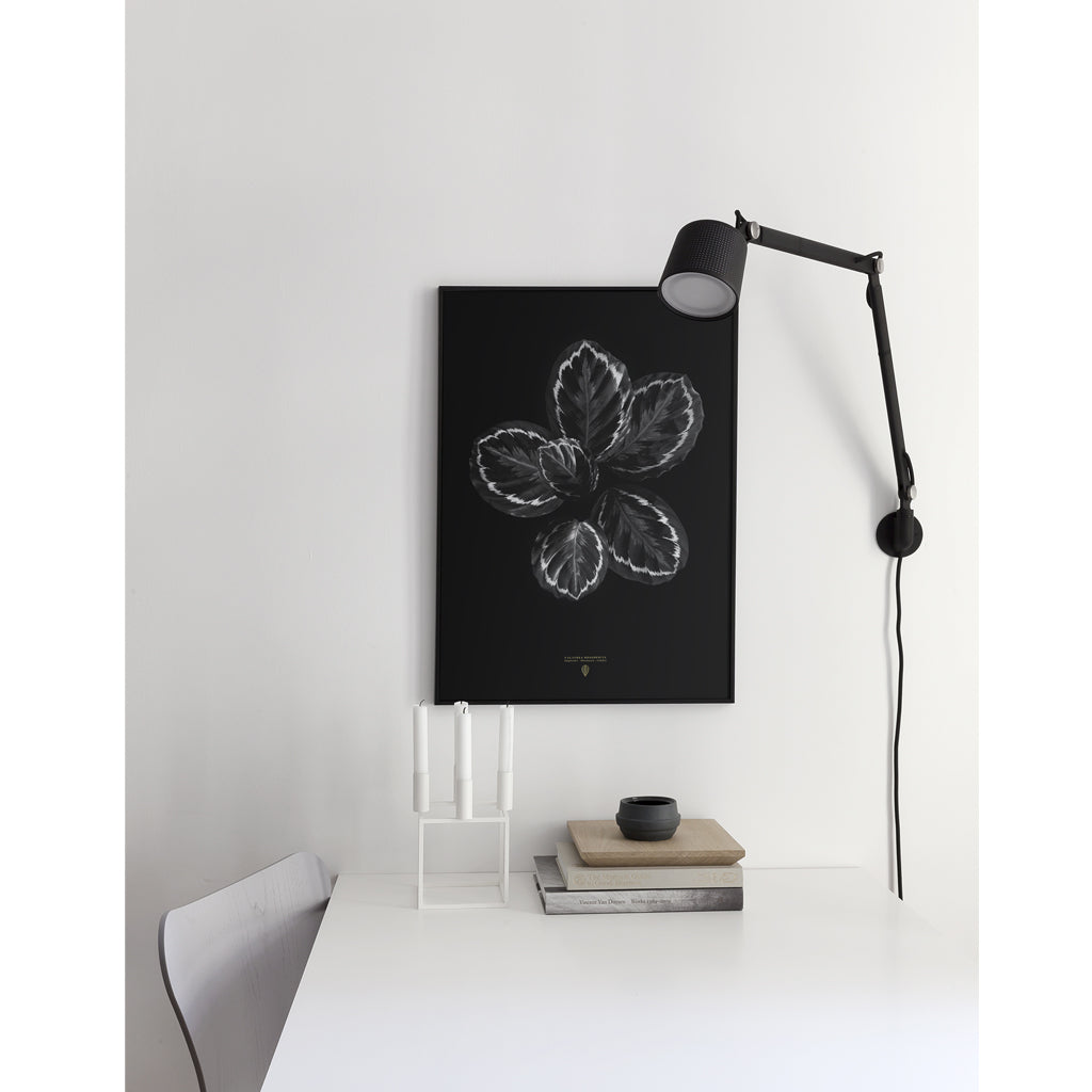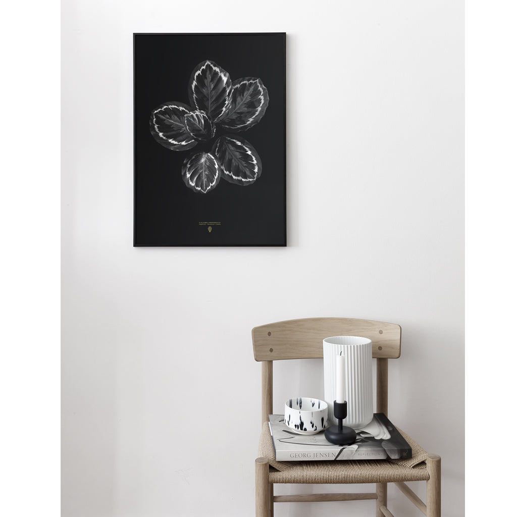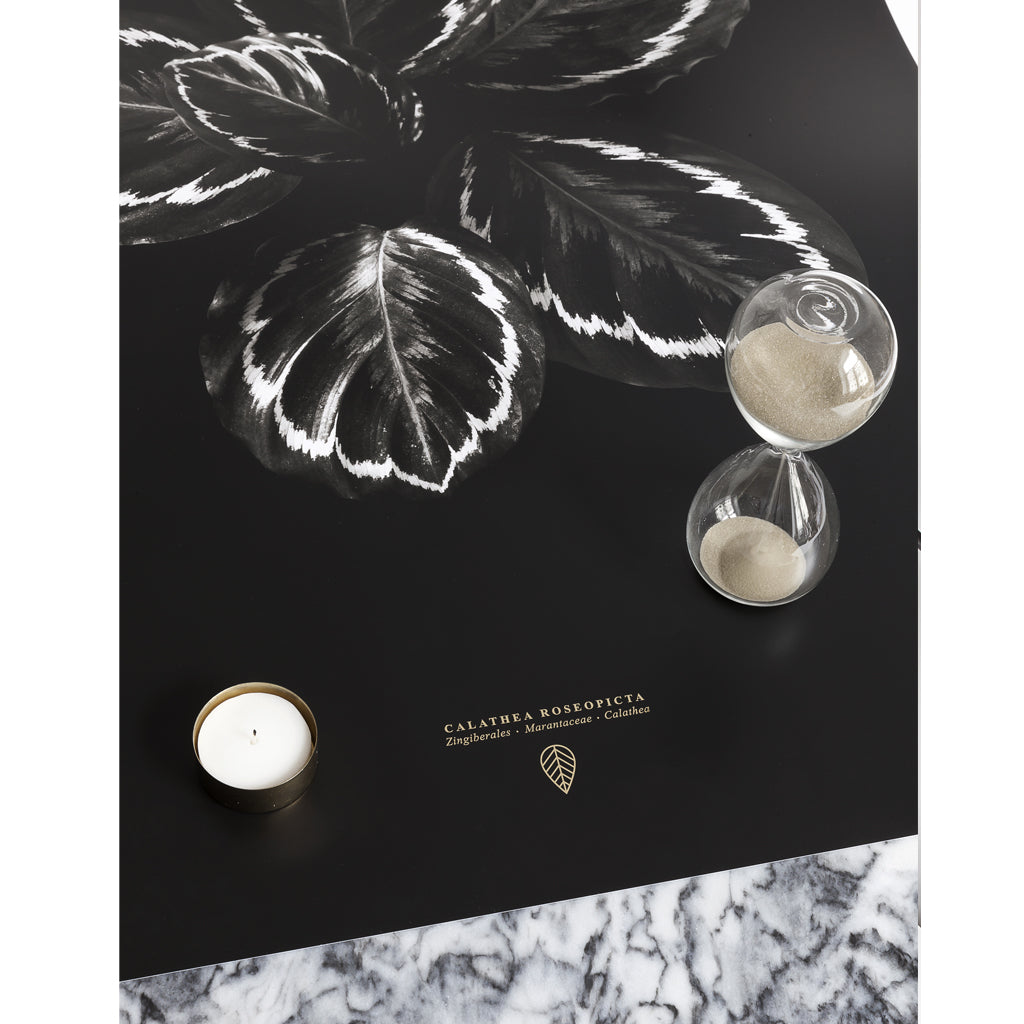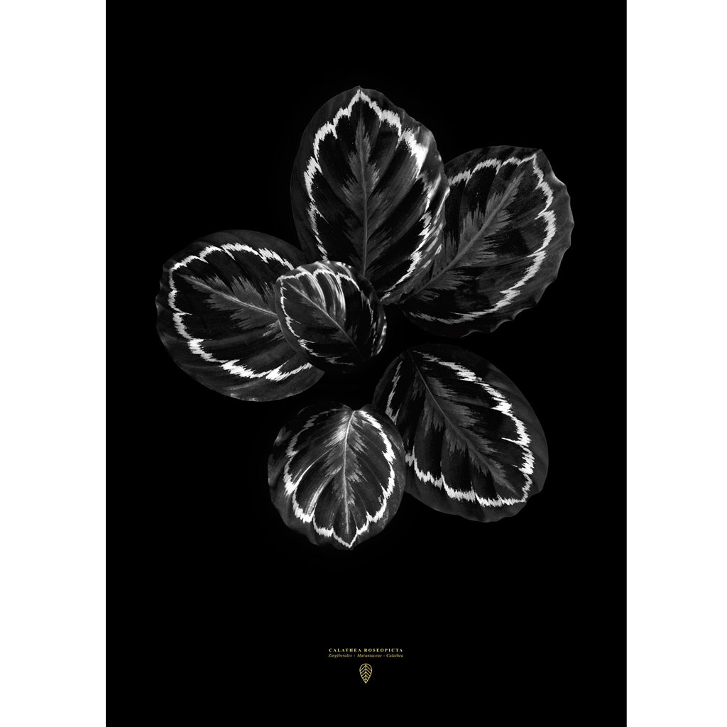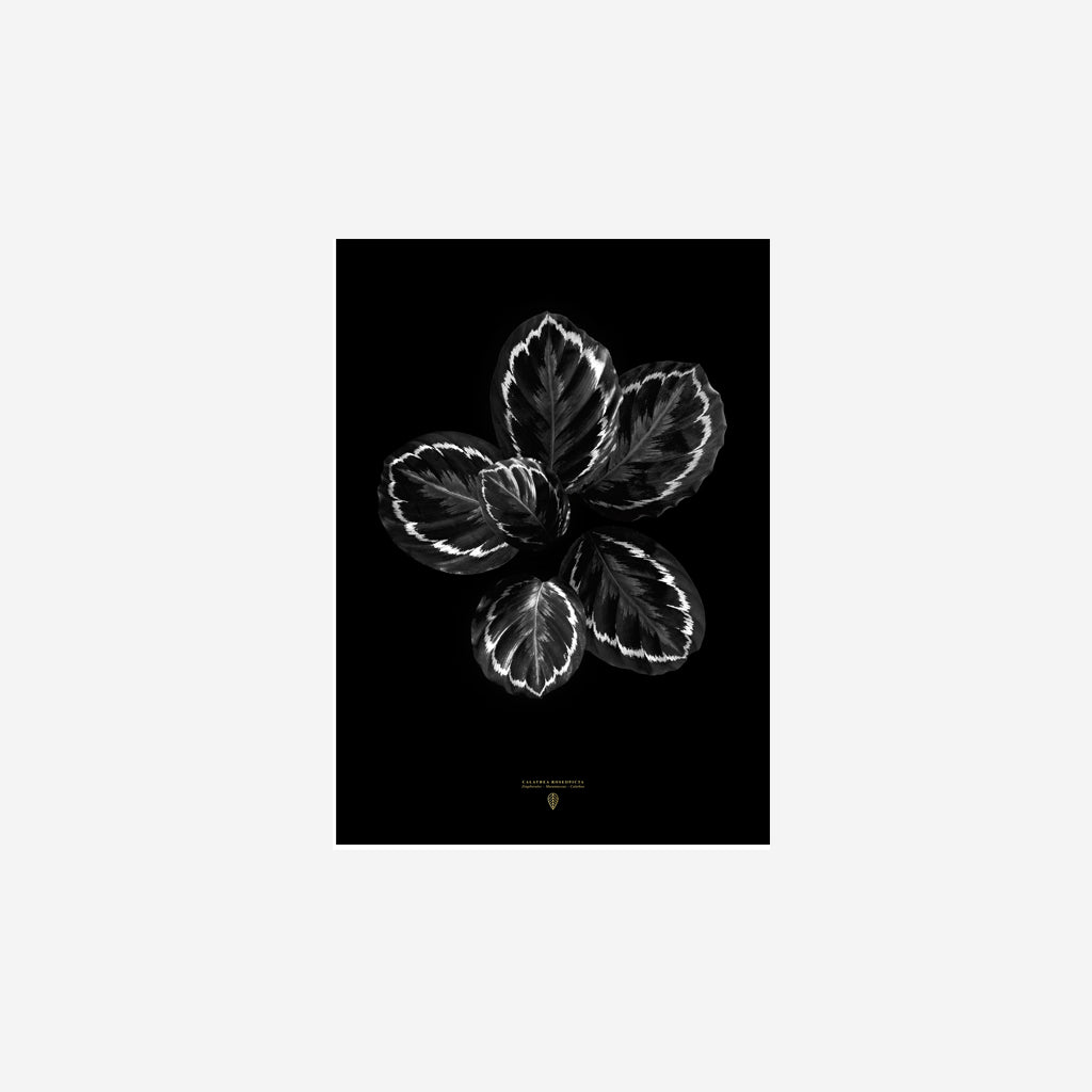 This print is part of the 'Natureza Morta' series, depicting the leafs of the Calathea Roesopicta in a high contrast setting for a dramatic effect. The print includes the name, order, family and genus hot-foil printed in gold.