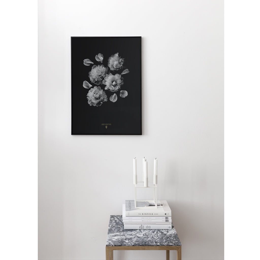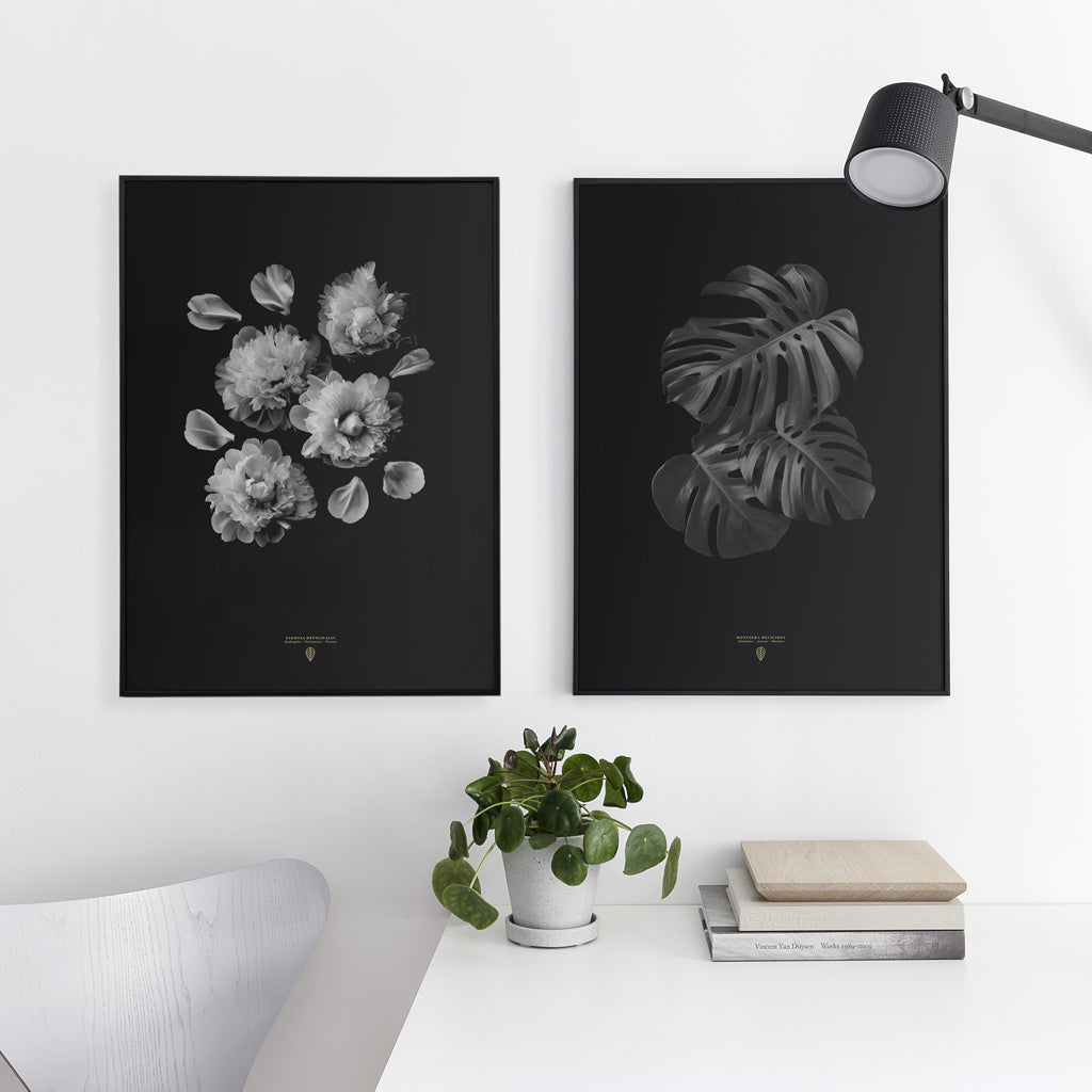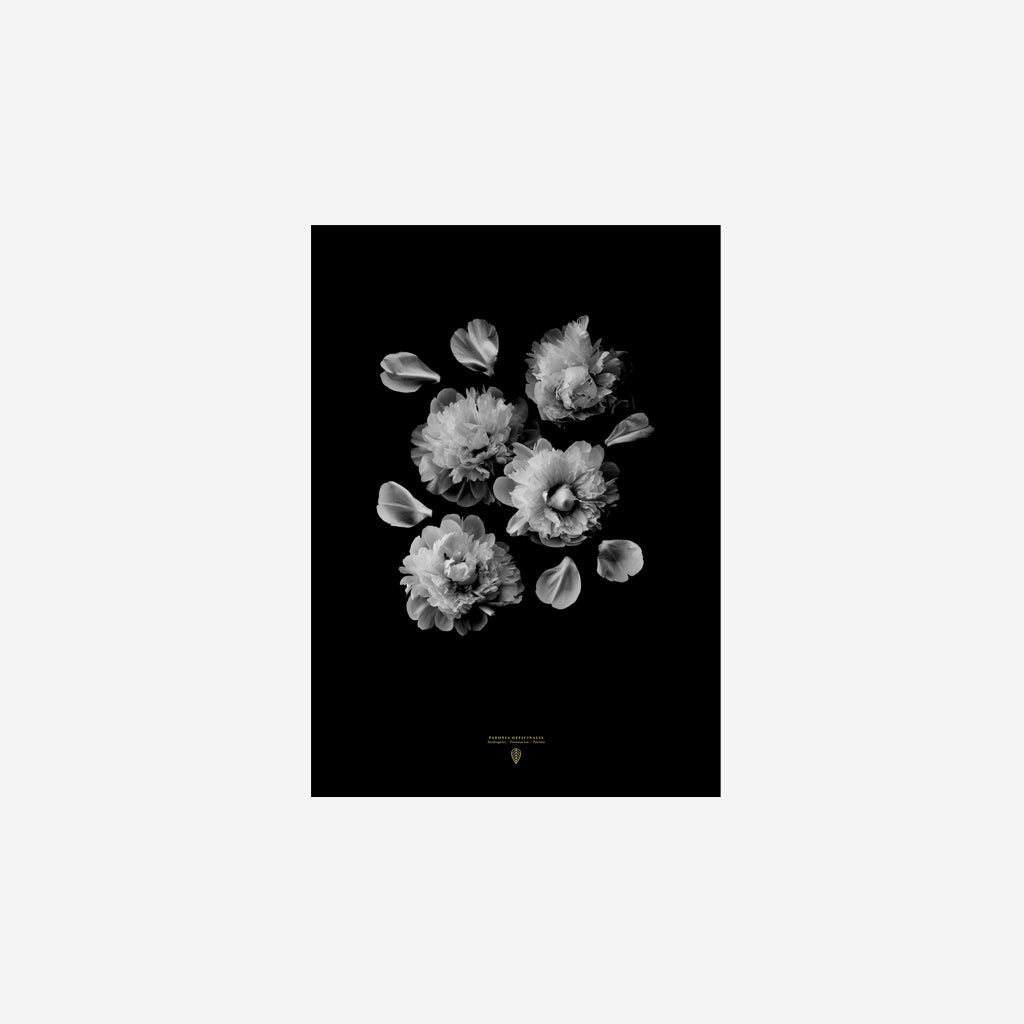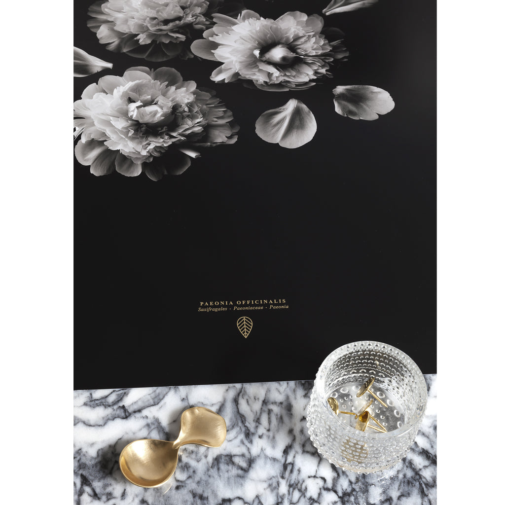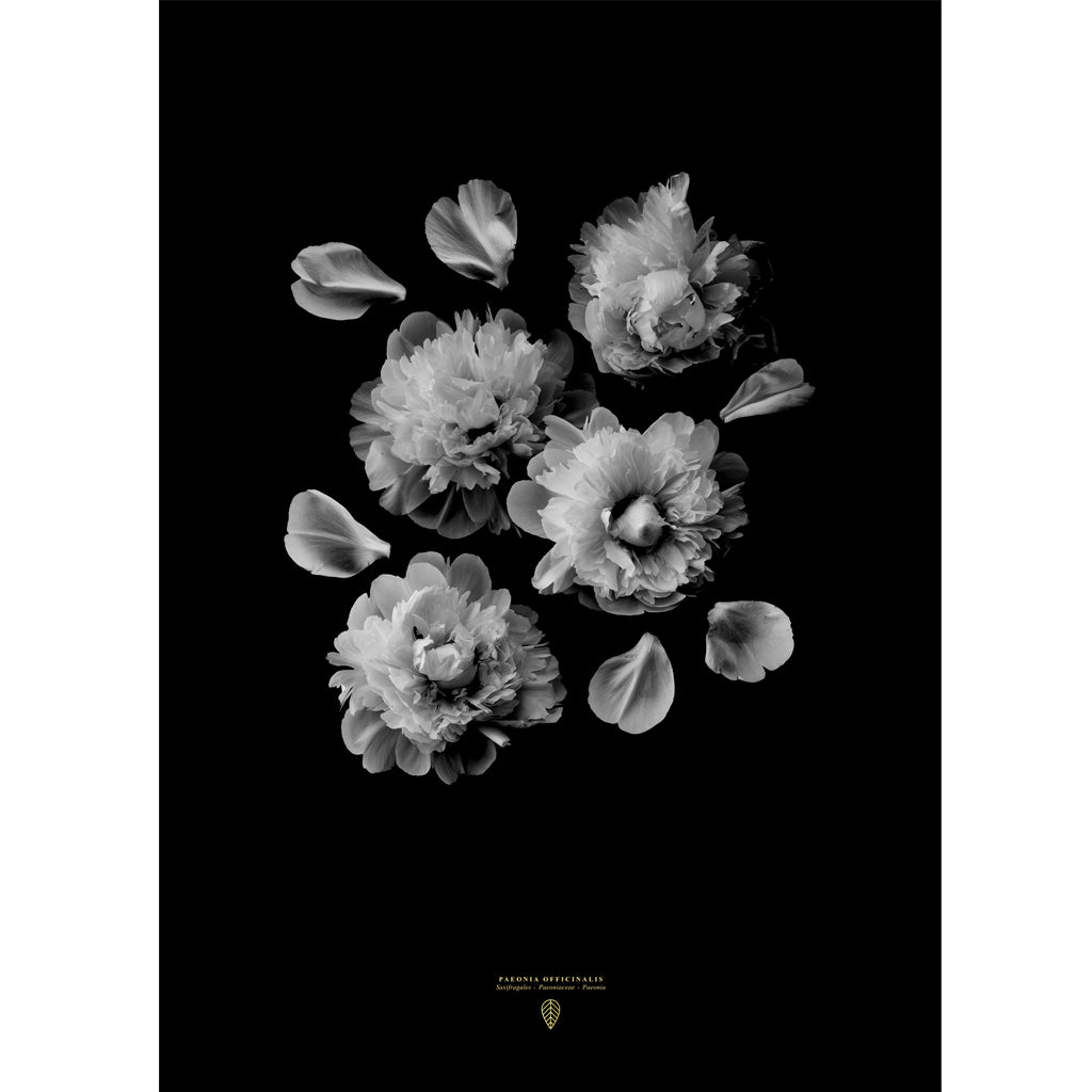 This print is part of the 'Natureza Morta' series, depicting the leafs of the Paeonia Officinalis in a high contrast setting for a dramatic effect. The print includes the name, order, family and genus hot-foil printed in gold.