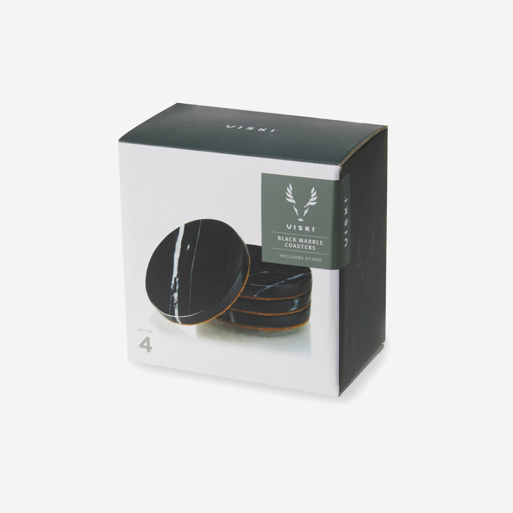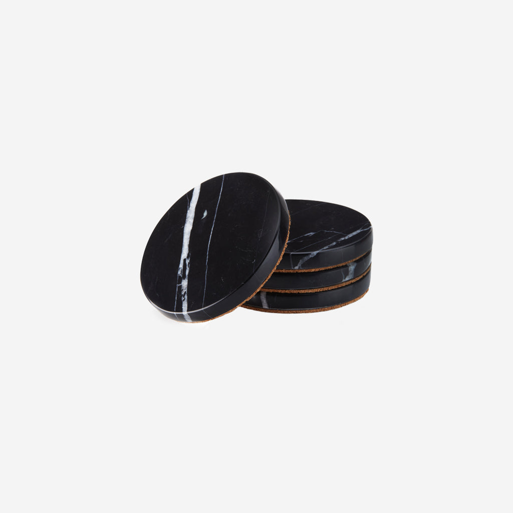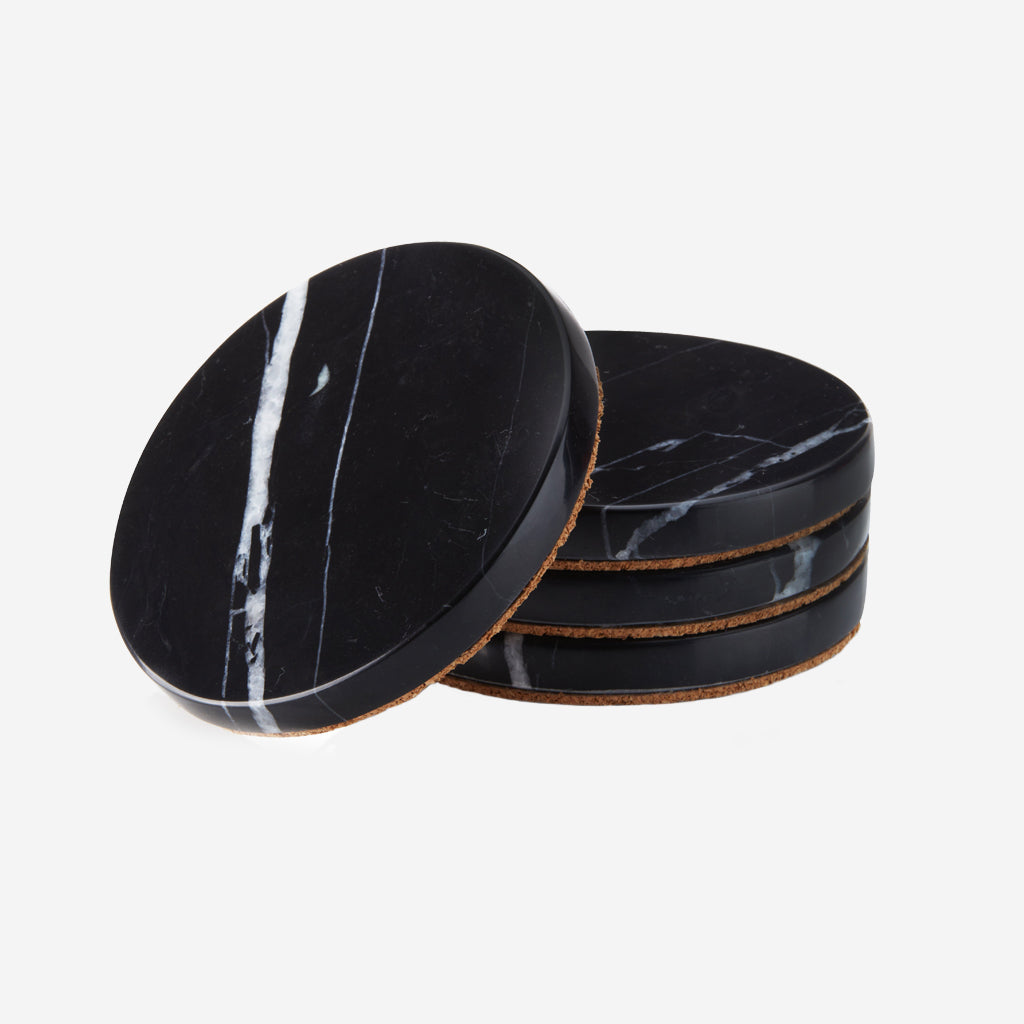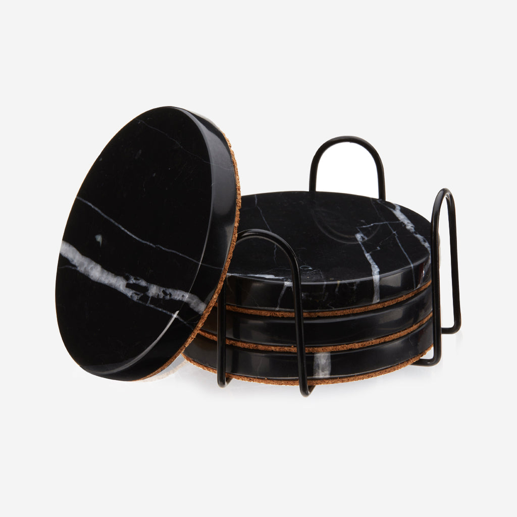 Real black marble threaded with gray and white veining makes these coasters an eye-catching addition to your home decor. Complete with a black stand and cork backing to protect surfaces, it’s a regal place to set down your favorite cocktails.