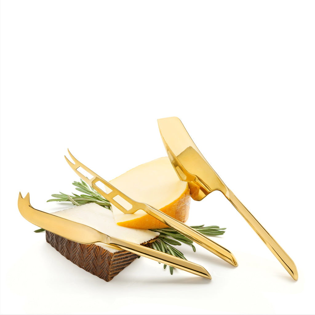 Slice and savor the likes of smoked gouda, Roquefort and Emmental with a sophisticated set of three mirror-plated gold cheese knives. Set features a small cleaver for hard cheeses, a perforated blade for soft cheese and a fork-tipped spear knife for breaking apart crumbly cheese.