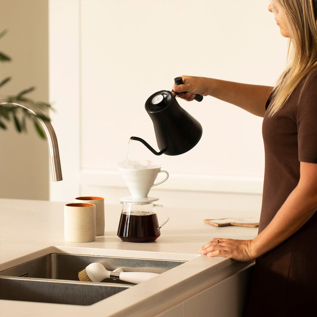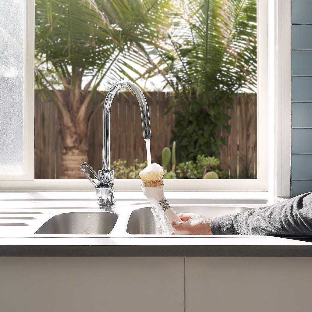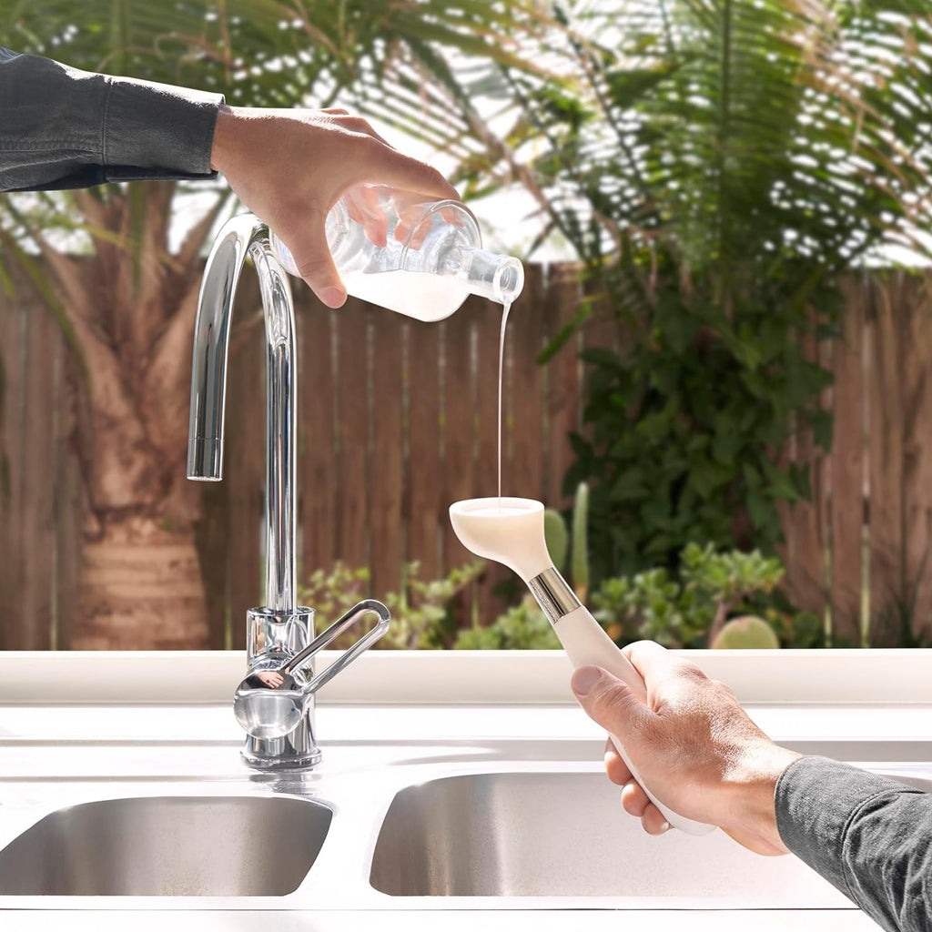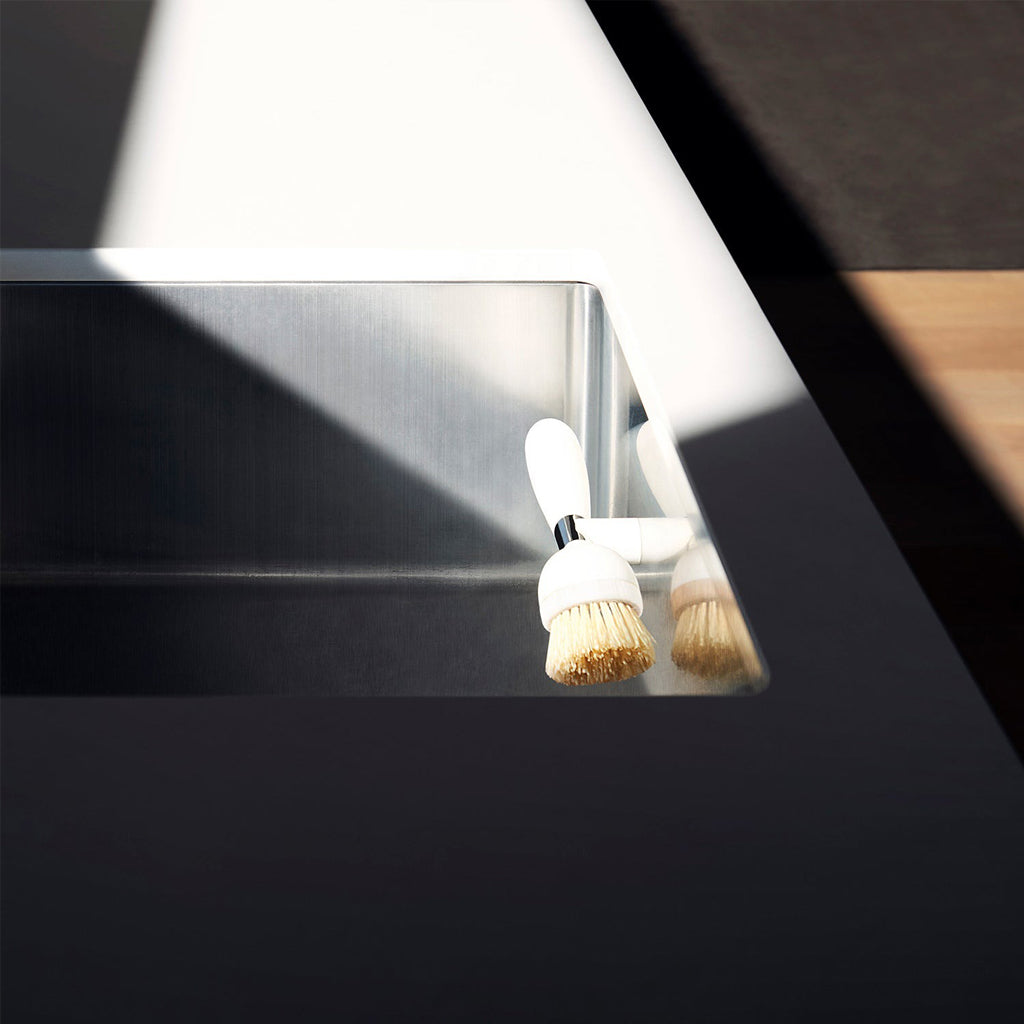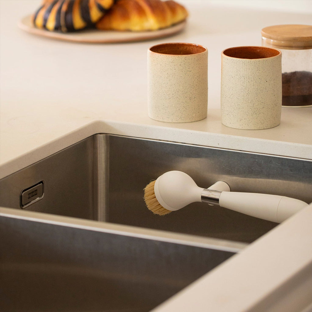 The One Brush tucks neatly into your sink, keeping your bench clutter-free and your brush clean, dry, and always within reach. Its magnetic stand attaches through any sink wall (up to 5mm thick) and can be easily repositioned whenever you need. The handle holds 75ml of liquid soap, easily refilled by unscrewing the brush head or brush base.