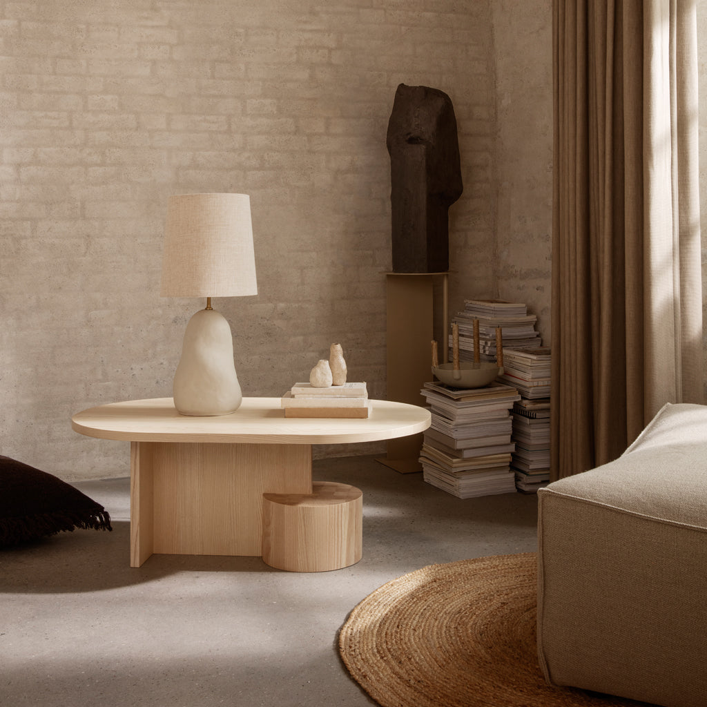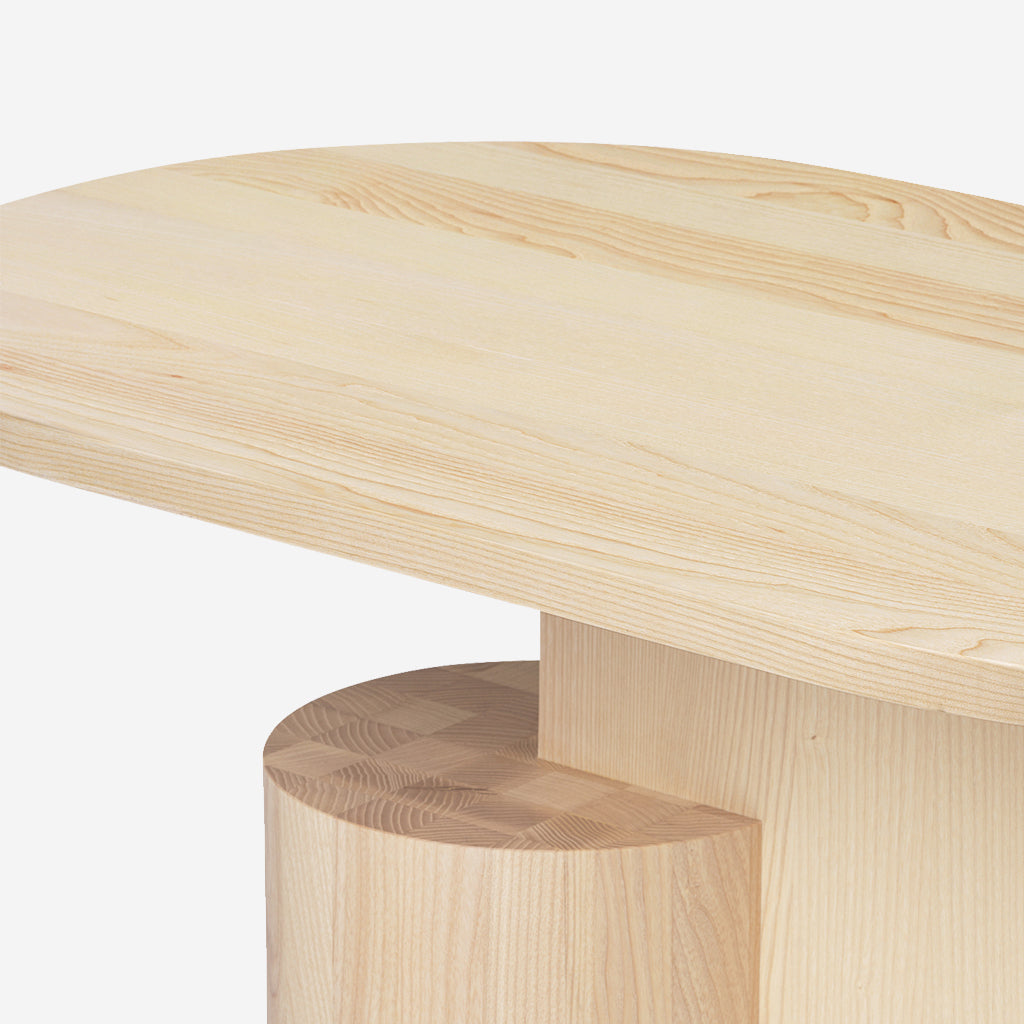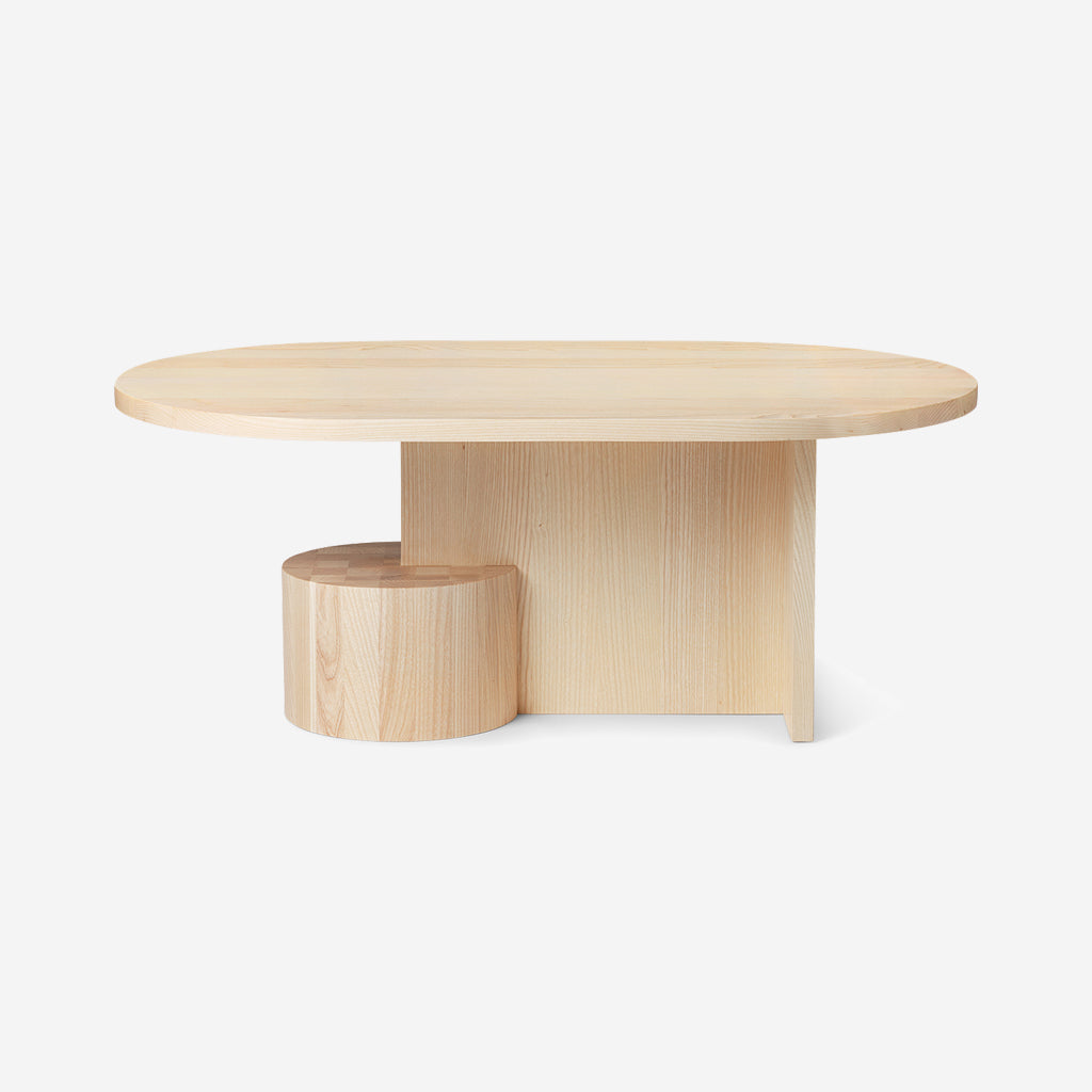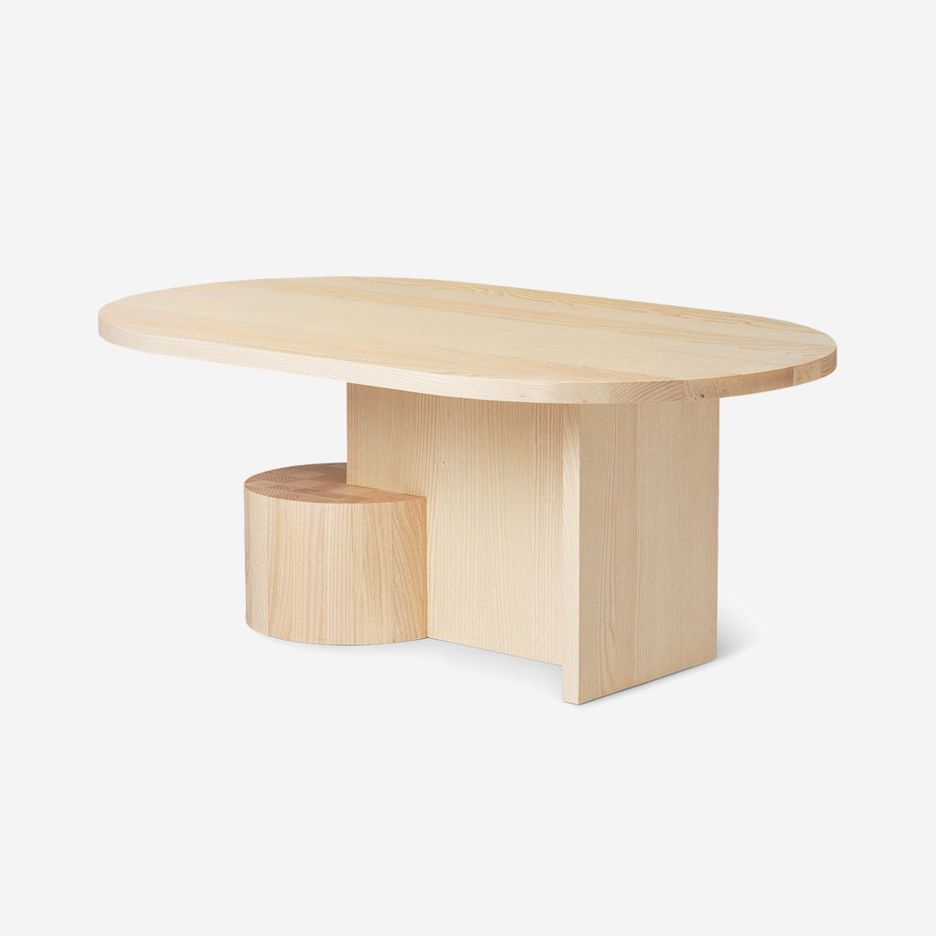 Crafted from FSC™-certified solid ash, the Insert Coffee Table is a sturdy yet sculptural piece. Playing with multiple shapes, the oval top rests lightly upon two geometric joints that are anchored by a heavy, cylindrical base.