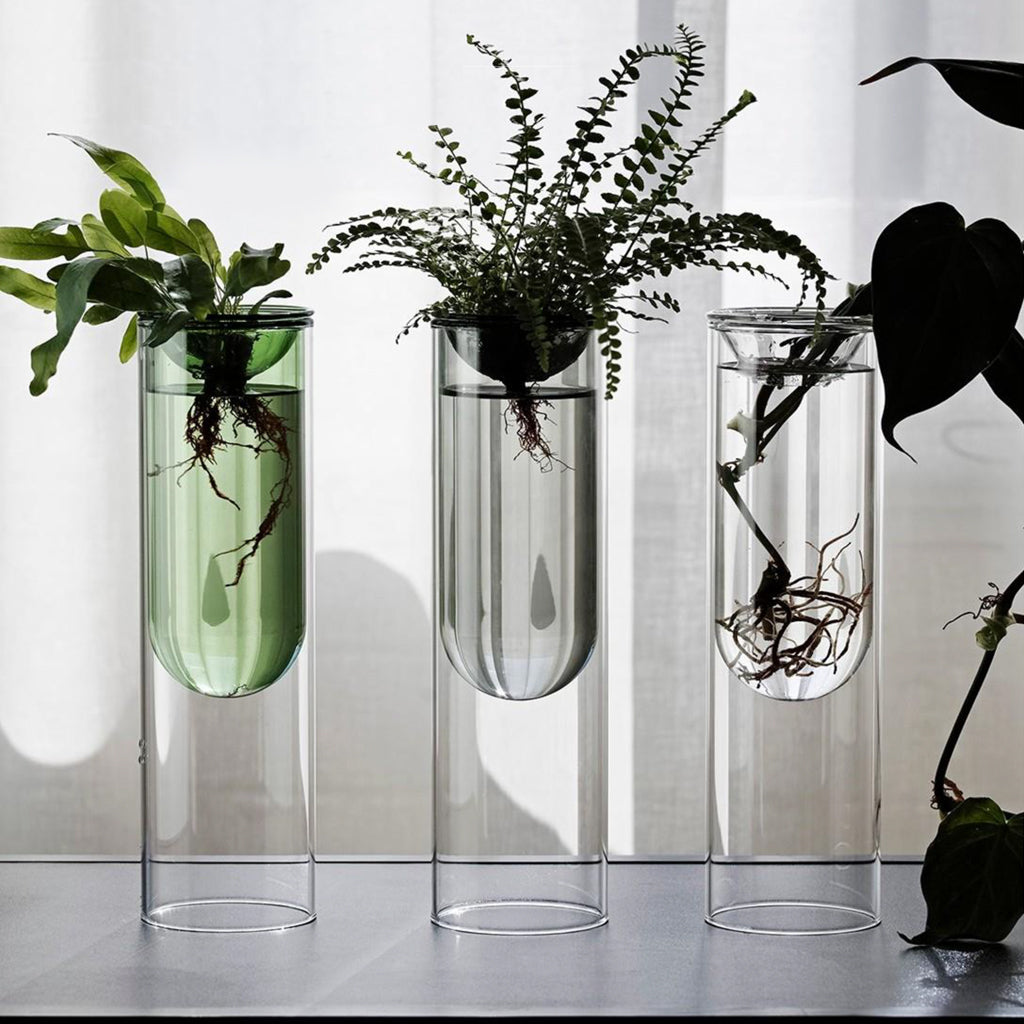 Tall and slender, the Propagation Vase is more than a mere decorative feature (though its looks are more than compelling enough to stand on its own), providing a home for cuttings, bulbs and stones to put down roots as you pay witness to the miracle of nature. Through the transparent borosilicate glass, you can marvel at the methodical growth of new life, privy to secrets that usually hide in the soil.