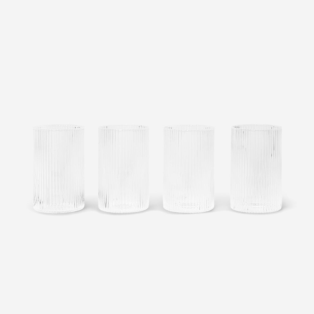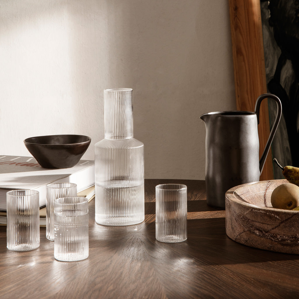 Inspired by small, delicate glasses traditionally used in French cuisine to serve little appetisers and desserts, this set of four mouth-blown glasses have a rippled surface that is distinctive to the series. Each glass can also be used as a lid for the Ripple Carafe and make an elegant addition to the Ripple collection at your table setting.