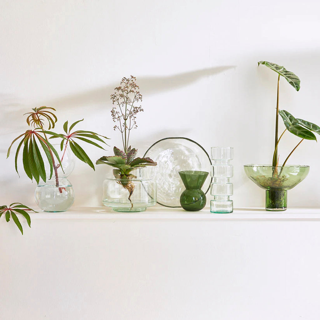 Fuzen, translating to ‘imperfect’ in Japanese, is part of Urban Nature Culture’s latest collection – and a special one indeed. Shaped like a tight bouquet of flowers, it carries a quiet elegancy. Made of recycled glass, thousands of tiny pieces of glass were melted back together and given a new life. Fuzen is made by hand, given an irregular, organic body which looks different from each angle. Rocking a beetle shade, an earthly touch of green, this special vase lets your flowers unfold like no other.