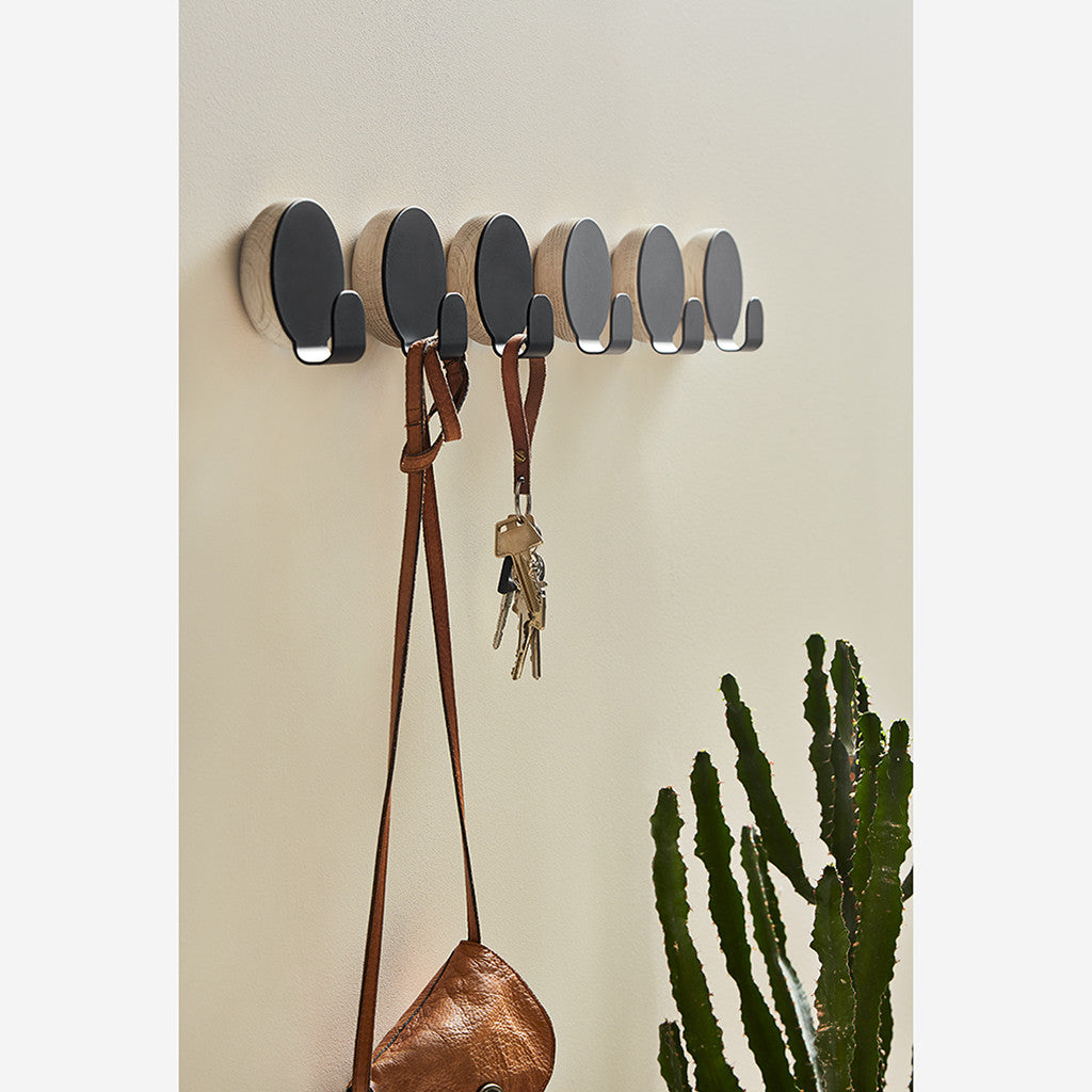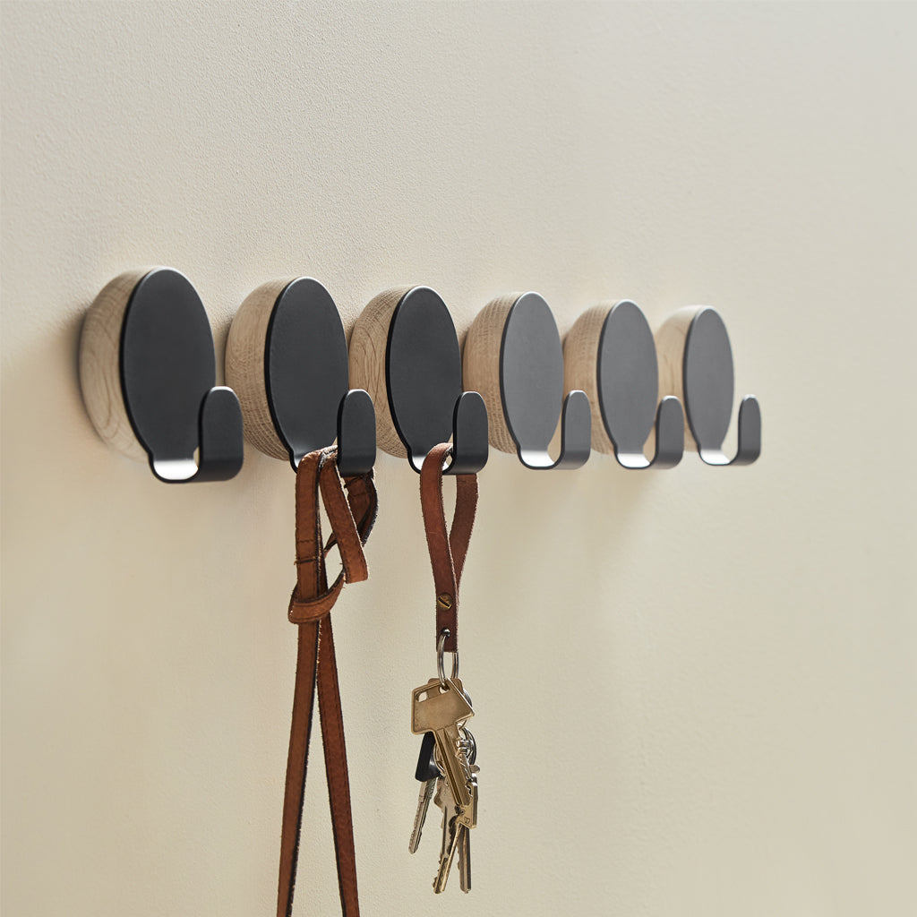 With its round shape and simple design, Haak combines both beauty and functionality. The combination of the strong metal hook and the soft oak creates an elegant solution for hangers, bags or jackets. The clean lines in the outline of the hook make it ideal for the hallway or bedroom.