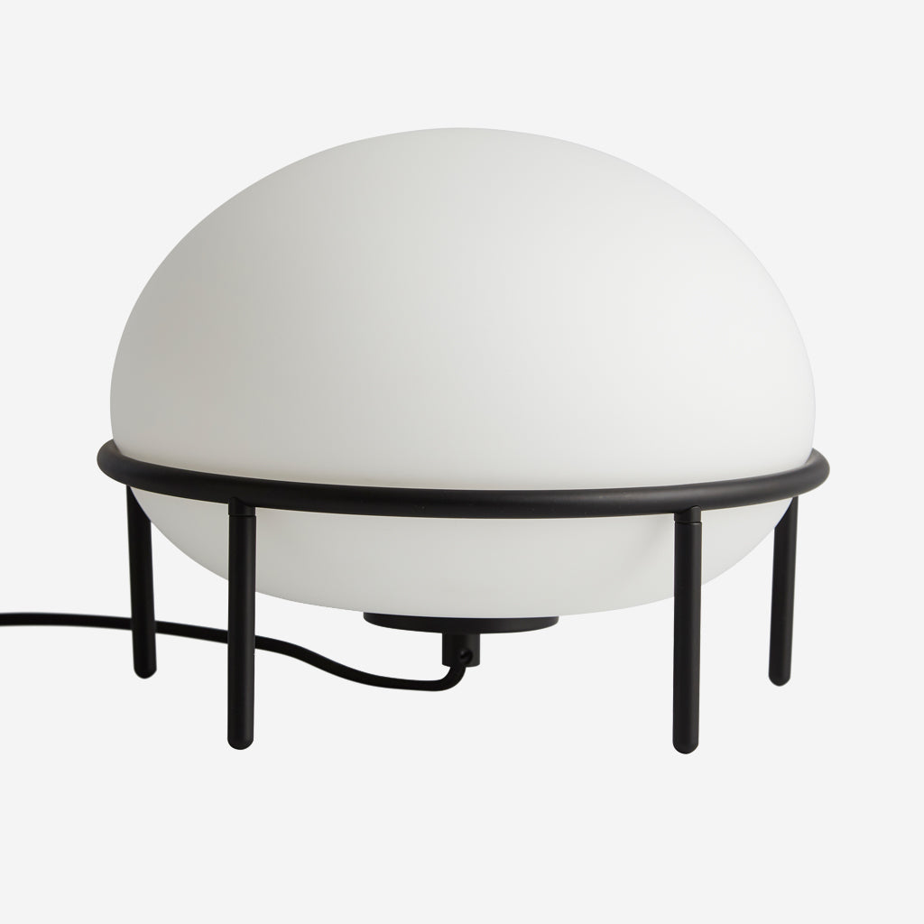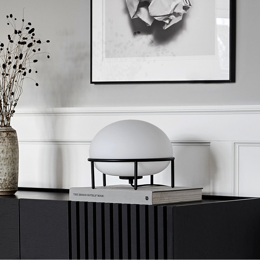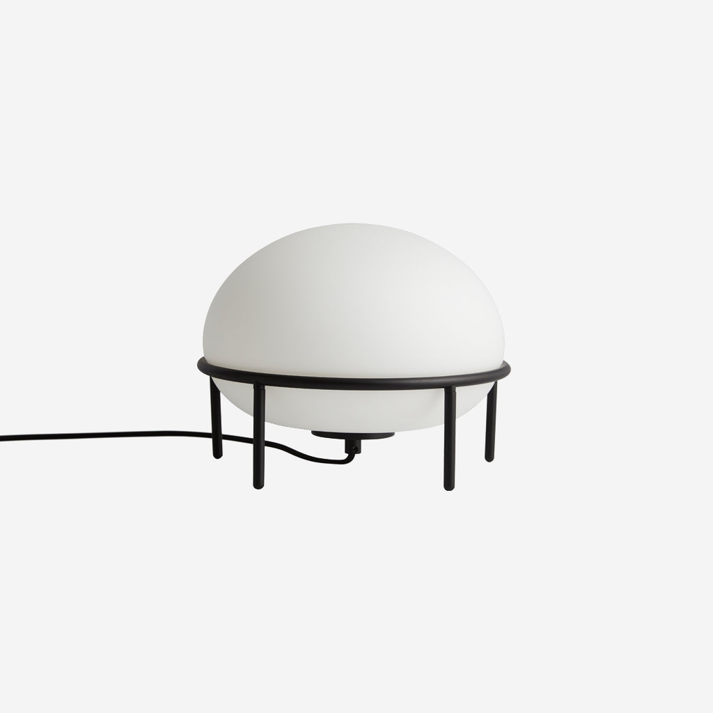 Pump is inspired by hot air balloons and the idea of a luminaire lifting off the ground. Floating in the air. The light tubular steel structure symbolises the propellant of a rocket, accentuating the effect of levitation of the shade. With its soft opal glass, Pump table lamp is ideal for smaller spots and setups where a pleasant light is needed. Whether that be on the desk, in the shelving system or on the window ledge.