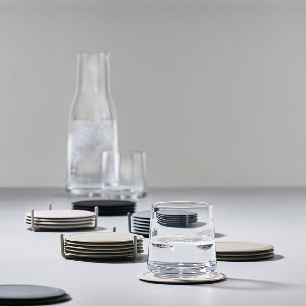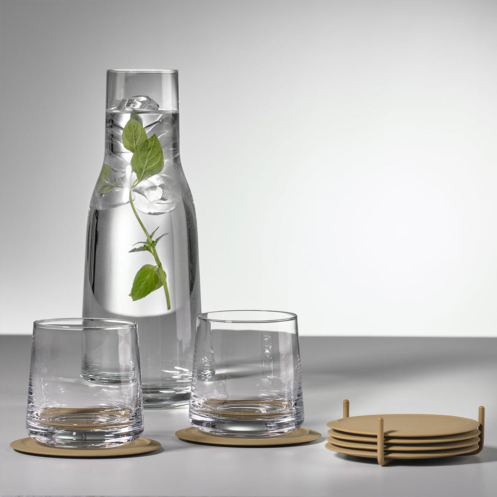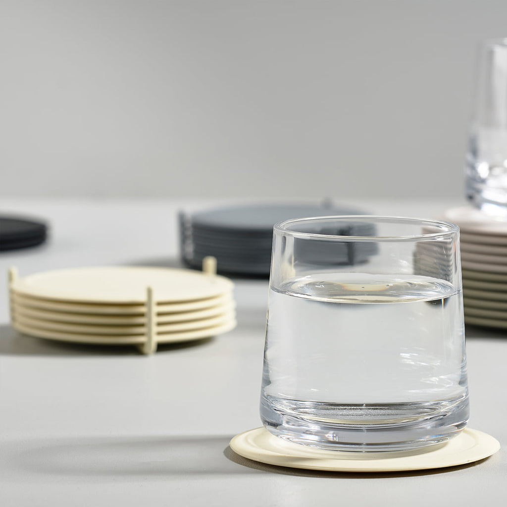A soft and silent landing is the best way of describing what happens when you put your glass down on one of the silicone coasters. These timeless and easy to clean coasters come in a set of six, with a practical metal holder that ensures you can easily keep the coasters neatly stacked while also rendering them a nice interior detail to keep on the dining or coffee table.