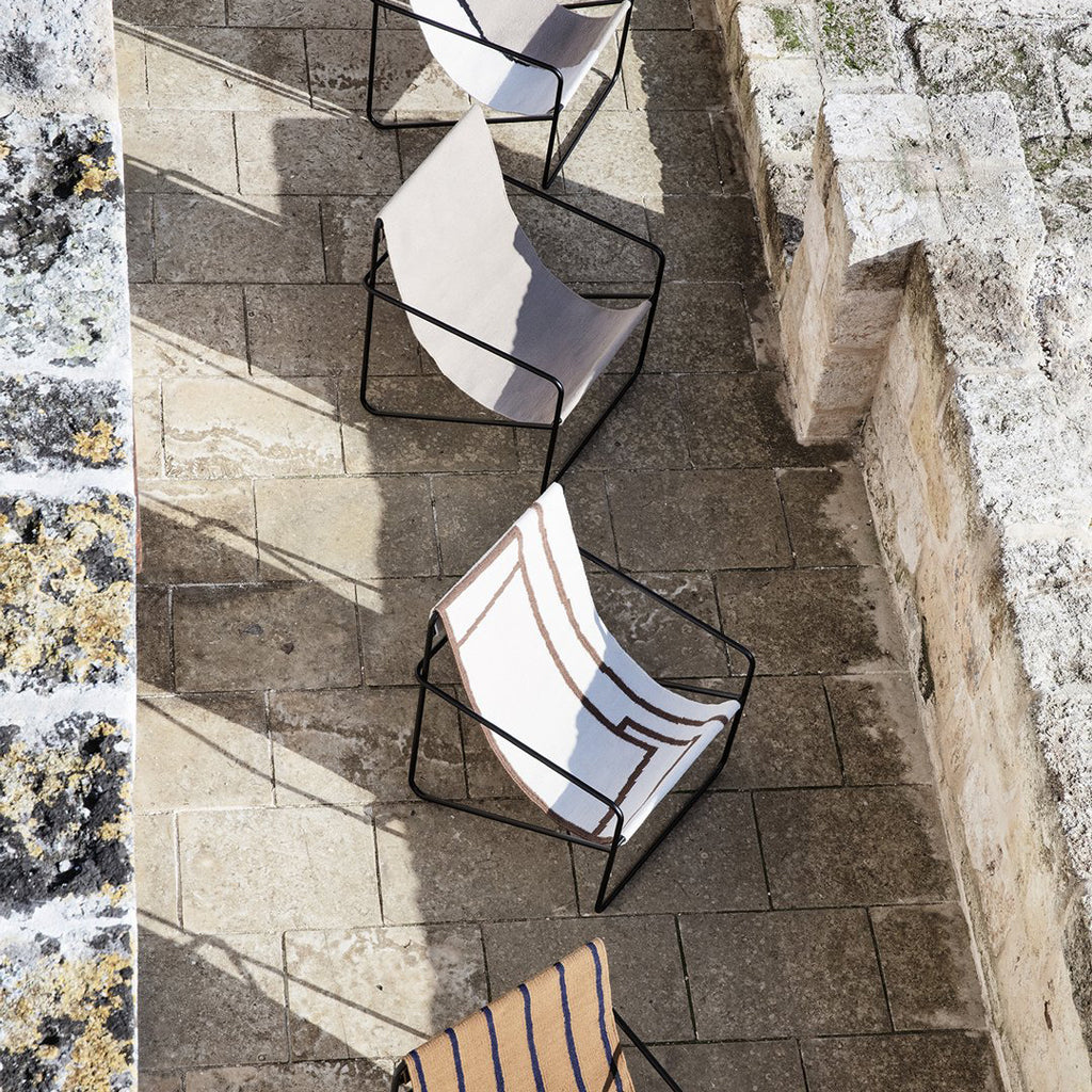 A modernist chair with a graceful profile, the Desert Lounge Chair is crafted from a tubular powder coated steel frame, holding an interchangeable woven textile seat made entirely from recycled post-consumer plastic that has been spun into PET yarn. Suitable for use both indoors and out, the lounge design invites relaxation.