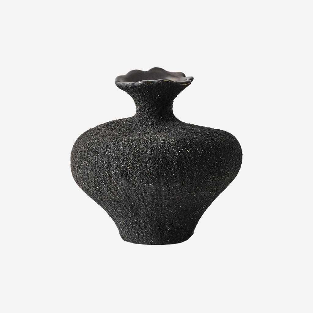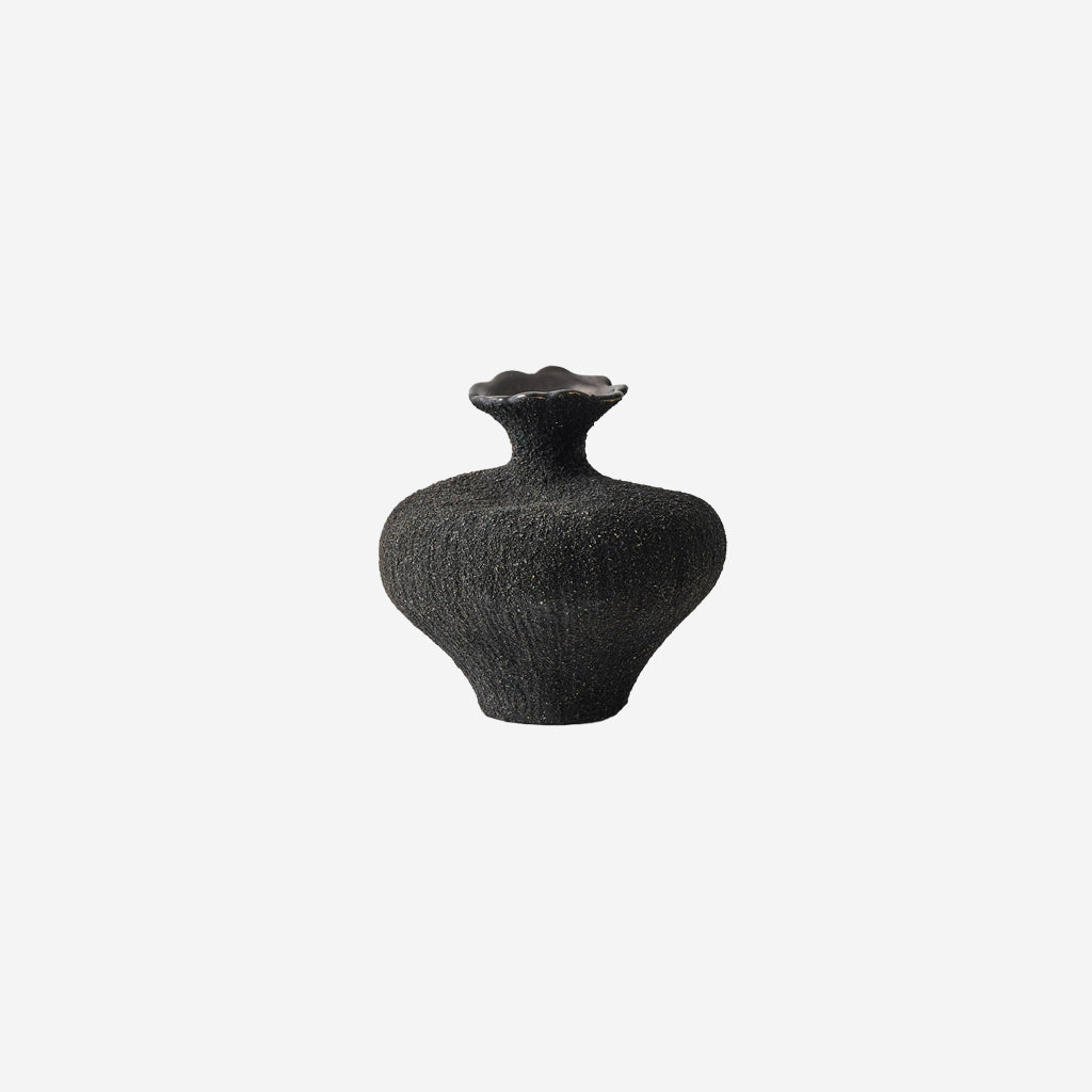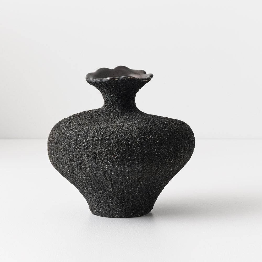 This small decorative pot has a distinctive, almost deflated appearance, making it an intriguing and unique piece unlike anything else.