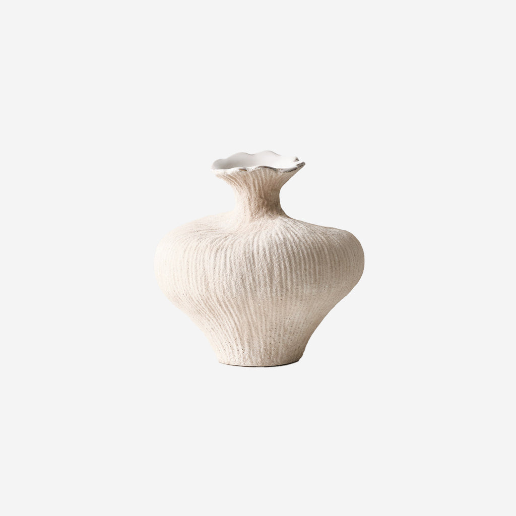 This small decorative vase has a distinctive form, making it an intriguing and unique piece unlike anything else.