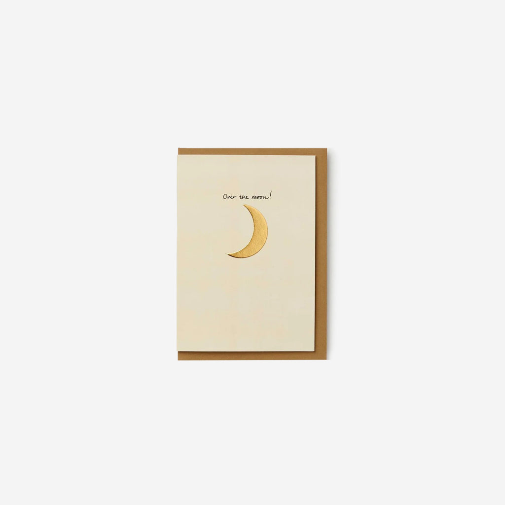 A simple, but lovely congratulations or new baby card with a gold, embossed moon and he words 'over the moon'. The card is a sand colour.