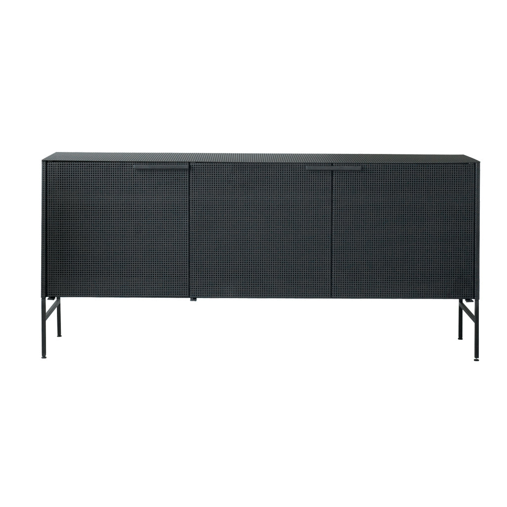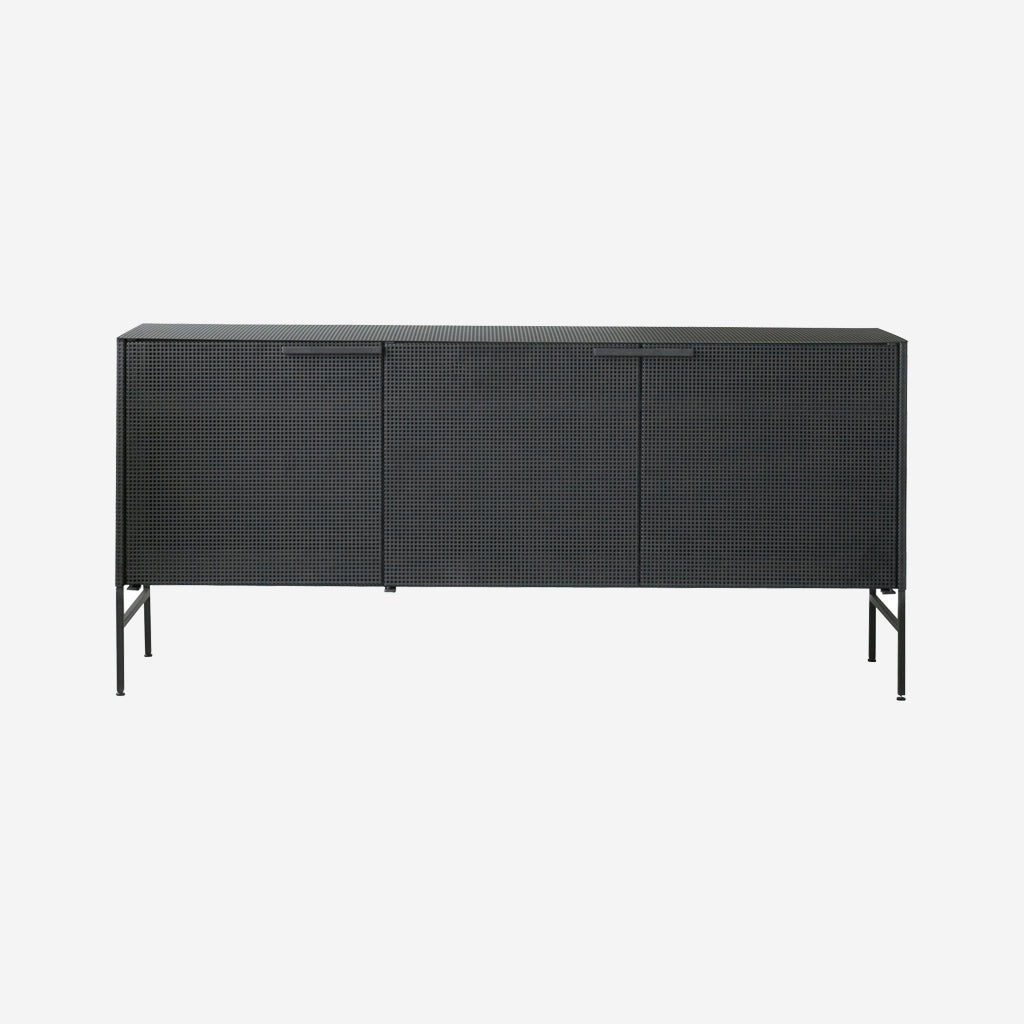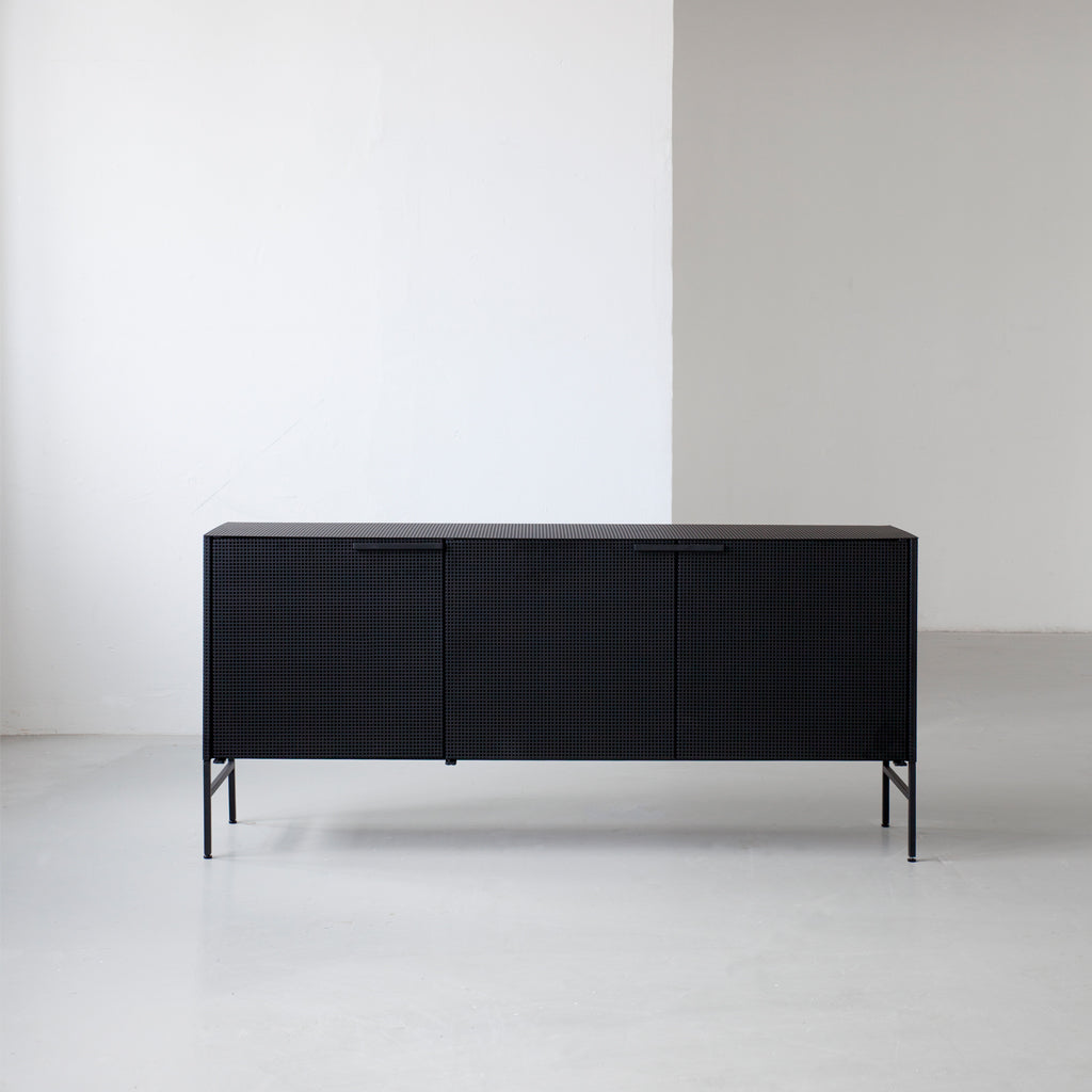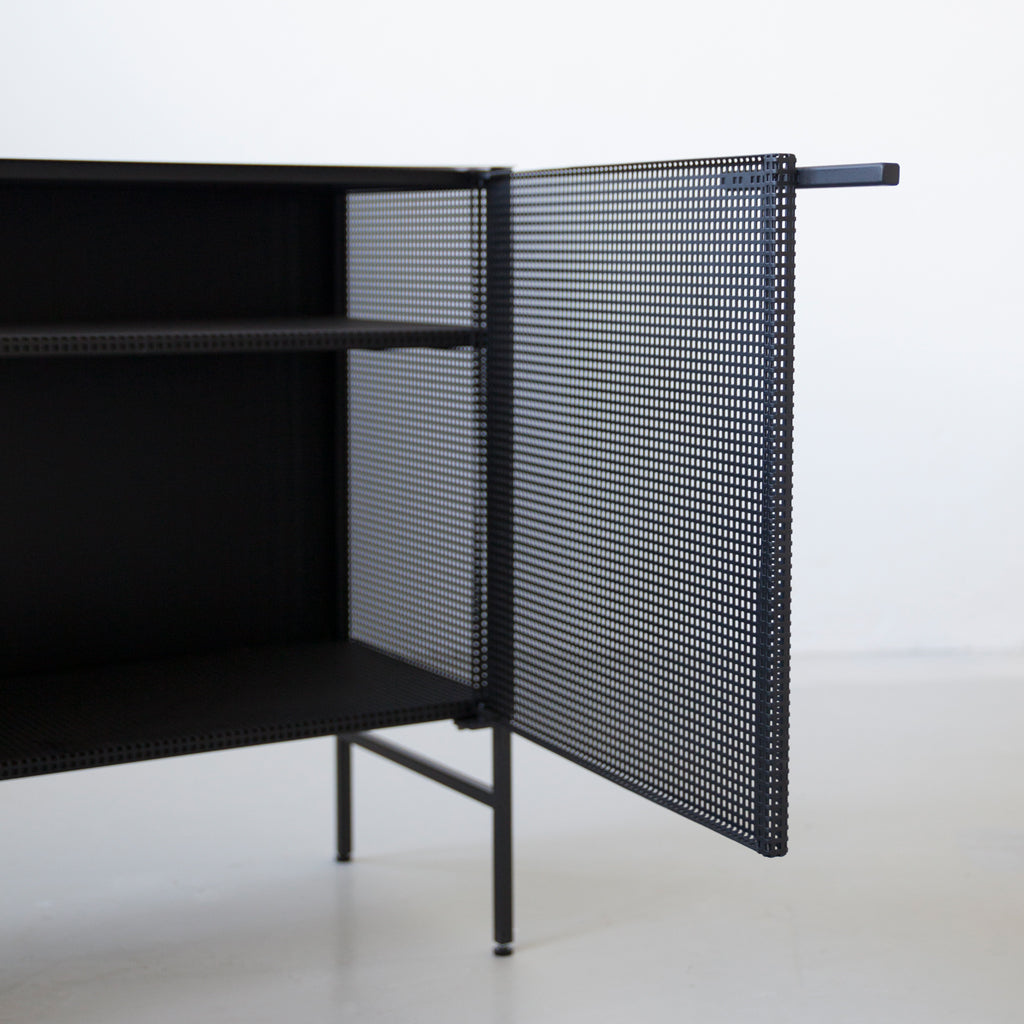 The Grid Sideboard is made of soft beige white perforated powder coated steel. An elegant sideboard with a transparent design. Use it for exhibiting accessories or as a remarkable spacious yet light storage unit.The sideboard comes with two perforated steel shelves and magnetic lock closure. The 3 cabinet doors swing outwards when opened.