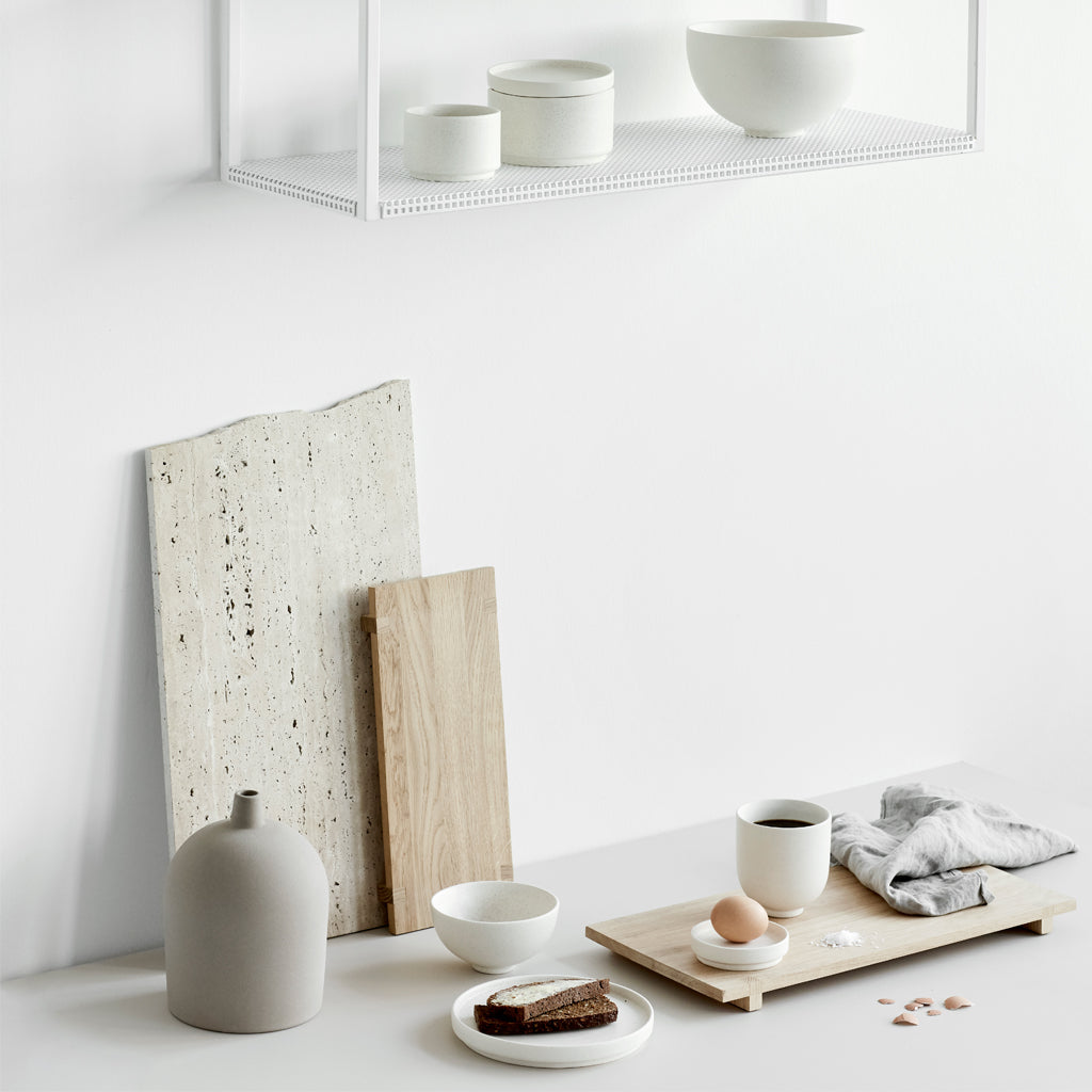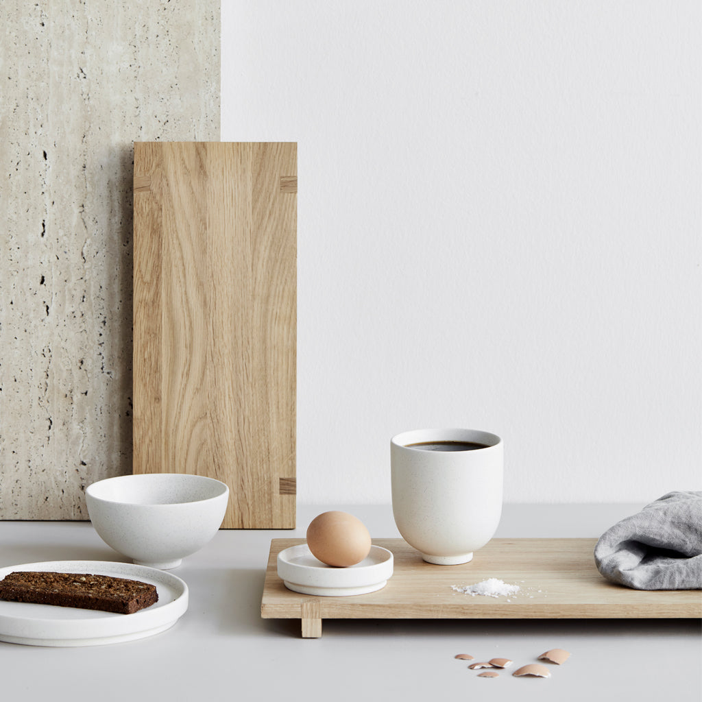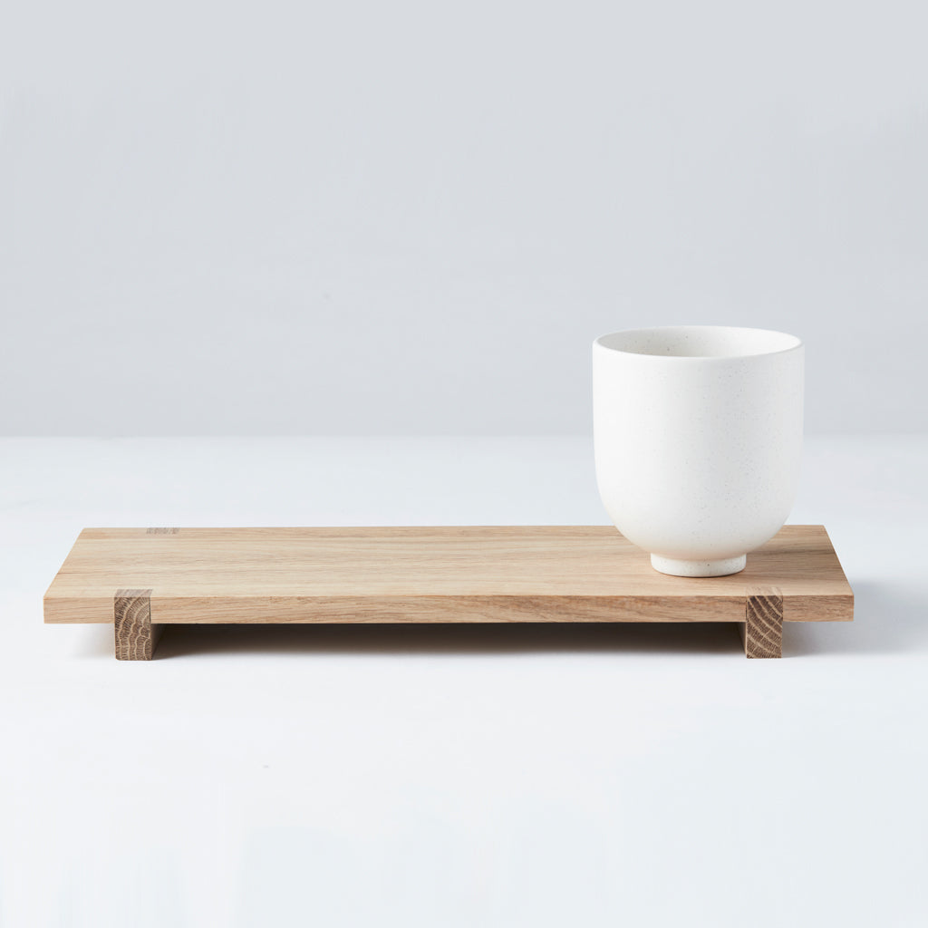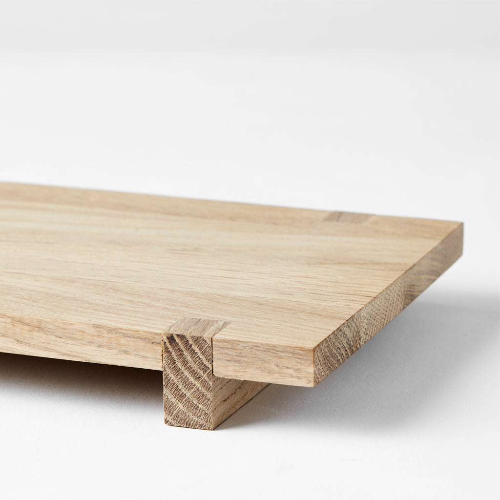 This oak serving board by Kristina Dam is perfect for serving tapas, charcuterie or cheese. This large Japanese Wood Board is a beautiful and simple tray with a Nordic and minimalistic look. Supreme when used to serve fresh fruit, desserts or a classic piece of danish pastry. We love the way that the two different directions of the oak wood meet in this design. The board stands on two oak surfaces that elevates the main cutting surface from the table. The floating expression makes it easy to lift up the serving tray from the table when serving but it also provides an airy and easy look.