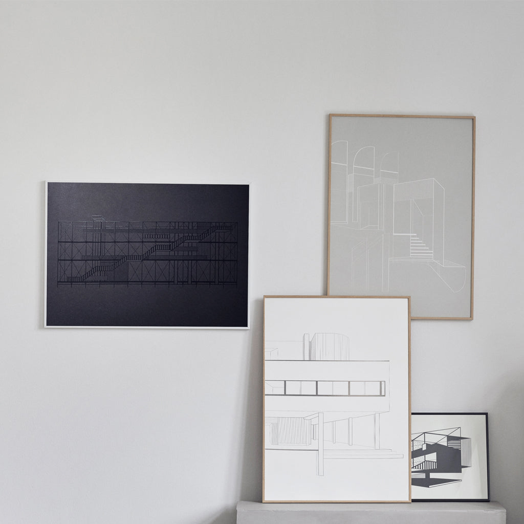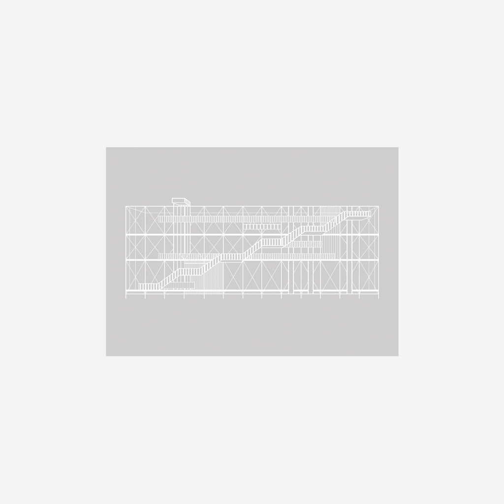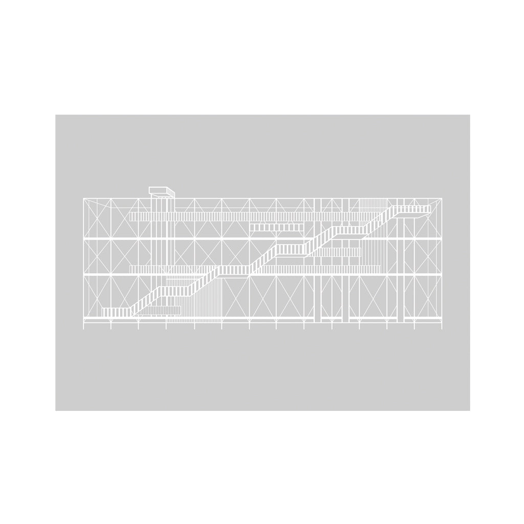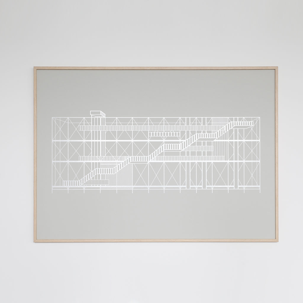 Inspired by the famous Centre Georges Pompidou in Paris, the Pompidou illustration is made on grey paper with white glossy vanish. A beautiful poster of a true architectural design classic.