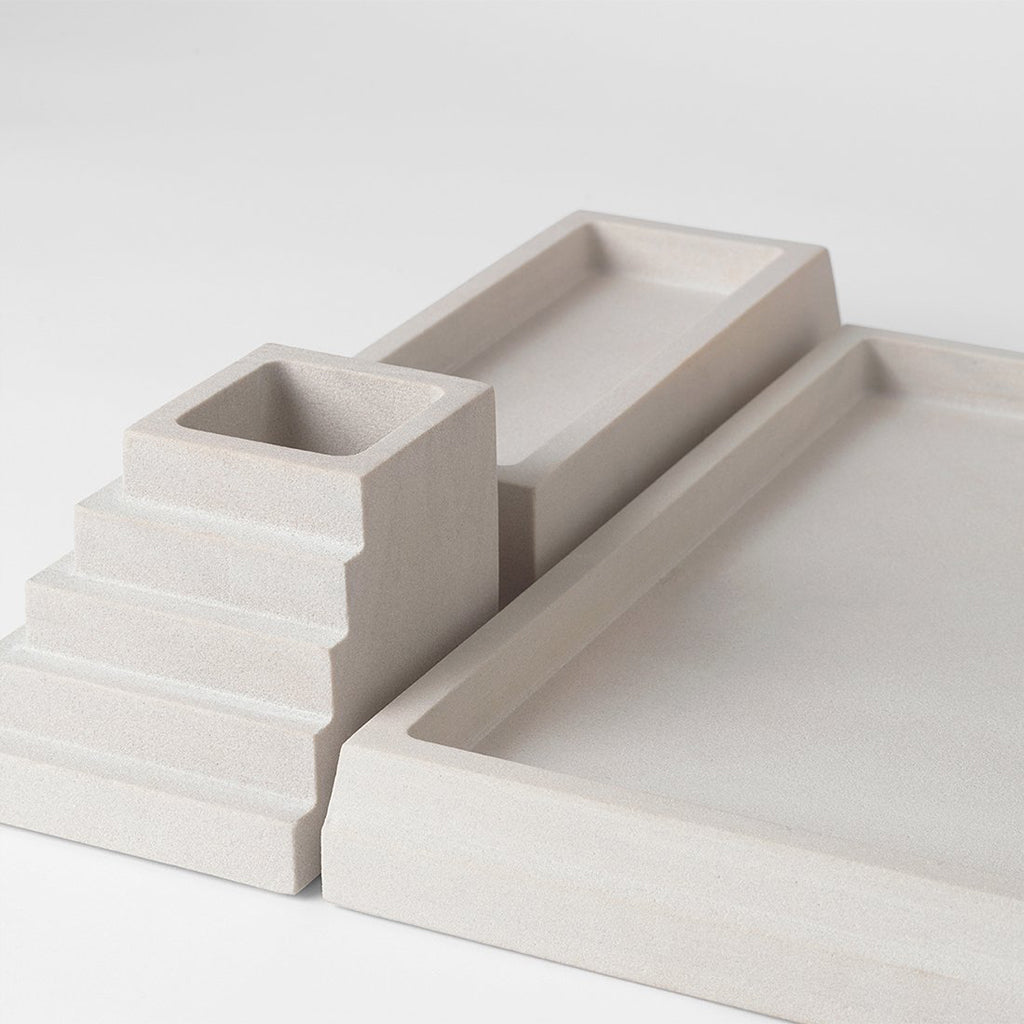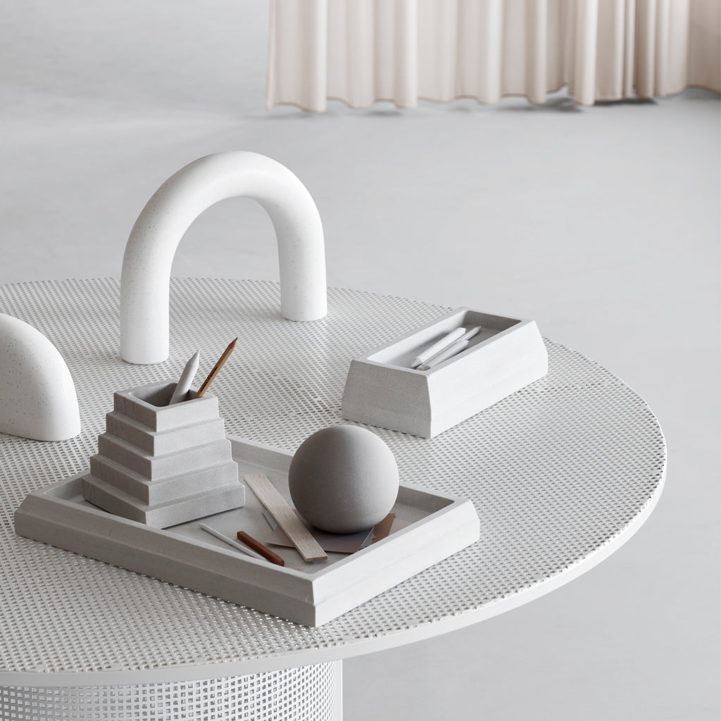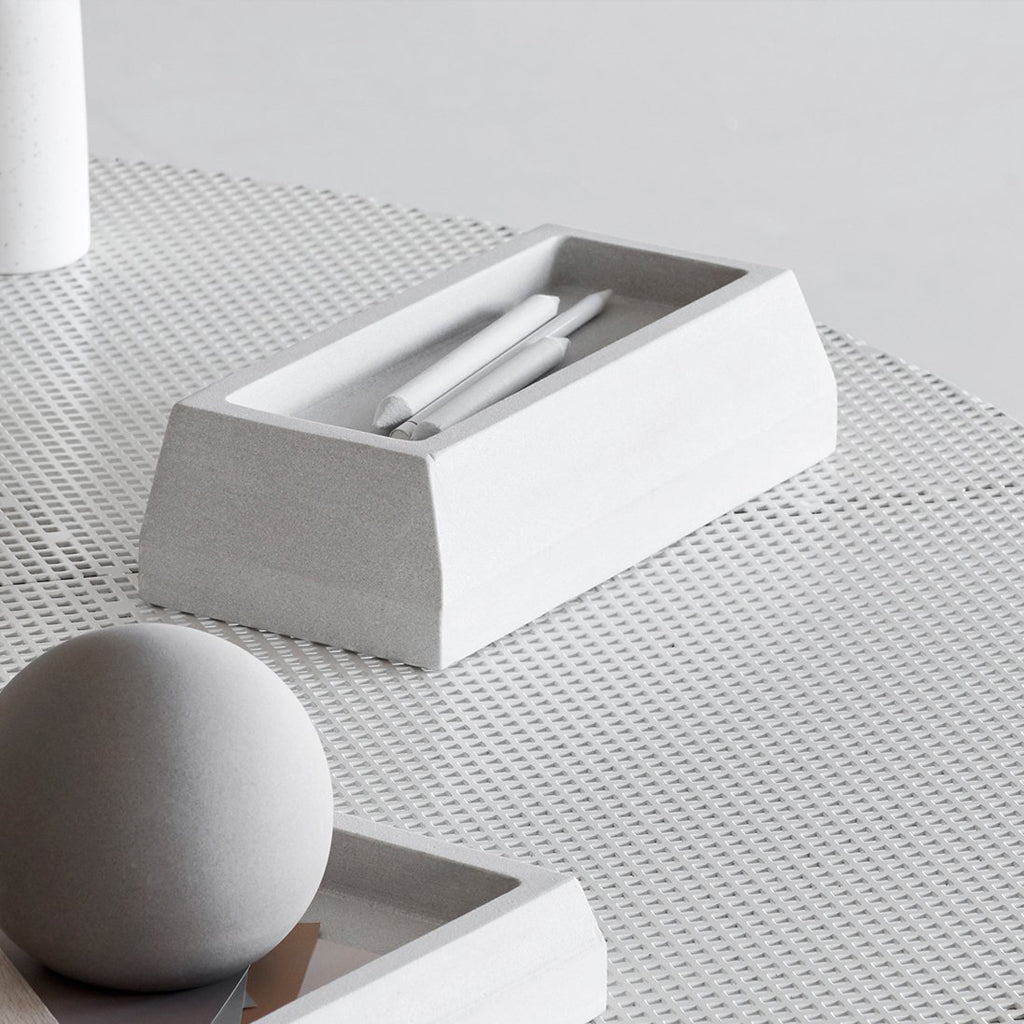 A medium desk organizer crafted in light grey sandstone. A danish designed large desk organizer with a clean soft toned appearance. Master the art of organising with the sandstone organizer and store your assortment of desk top items with style.