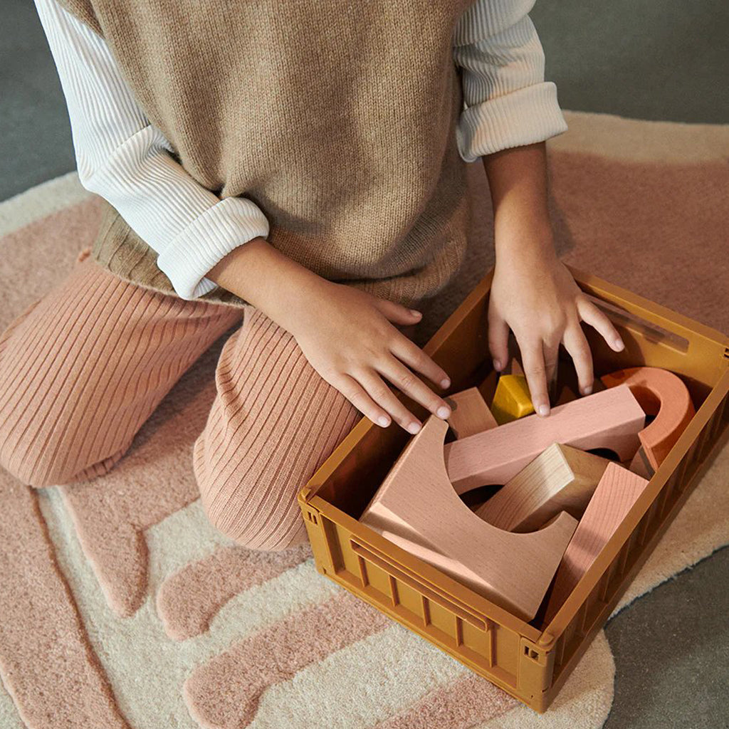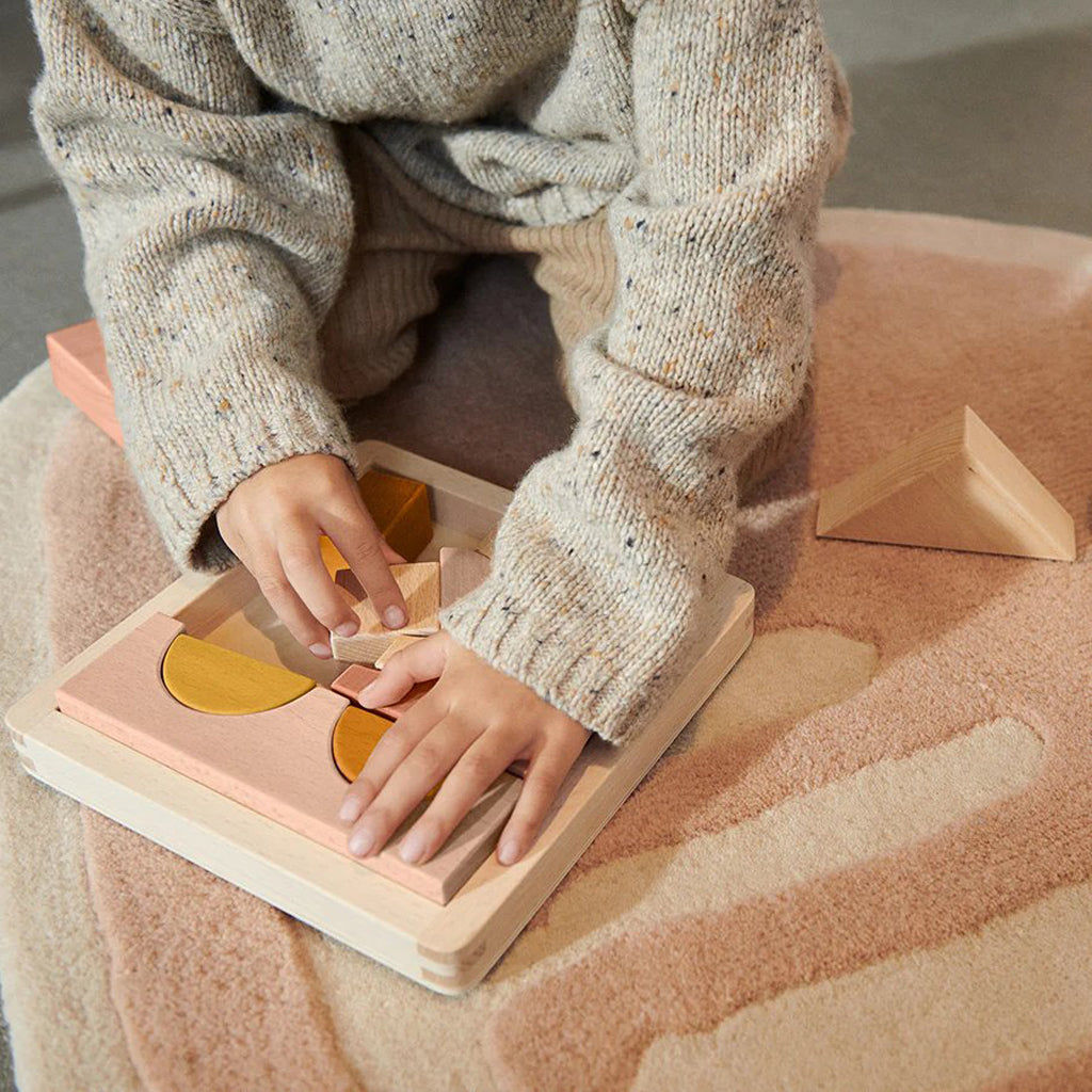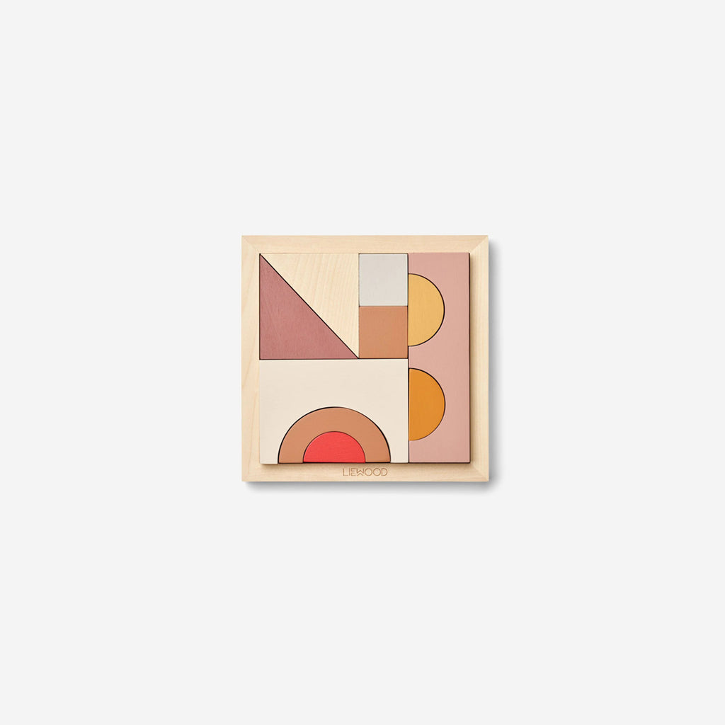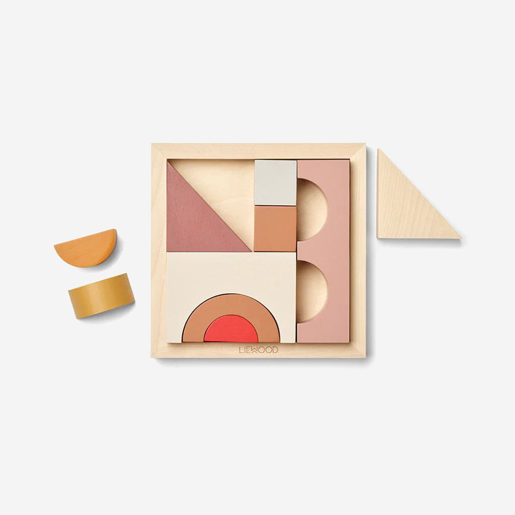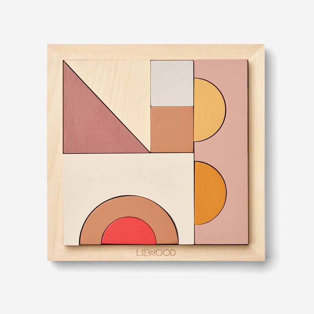 The Liewood Ishan Puzzle in rose is a geometric wooden puzzle that functions as both a fun puzzle game and a set of building blocks. Sculptural decor for your home.