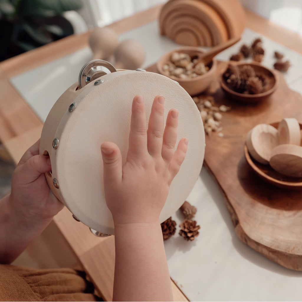 Make magic happen with our beautiful Tambourine Drum. Commonly used in folk music, the tambourine has been a very important part of folk music for many years. The tambourine is played with bare hands, banging on the drum with an open hand. This will assist with your little one's gross motor skills. Get ready for countless hours of singing and dancing, assisting with sensory development, and improved listening skills via sound experimentation. This is the perfect addition to your nursery or playroom.