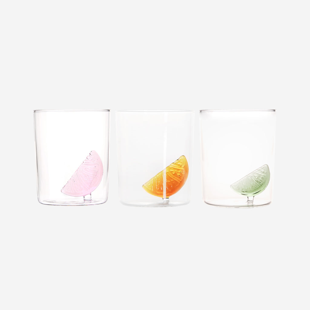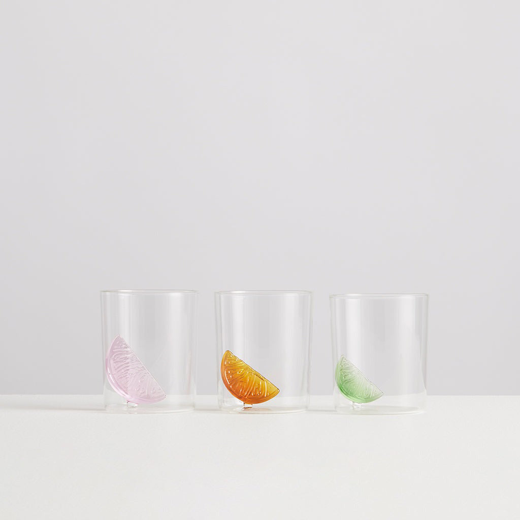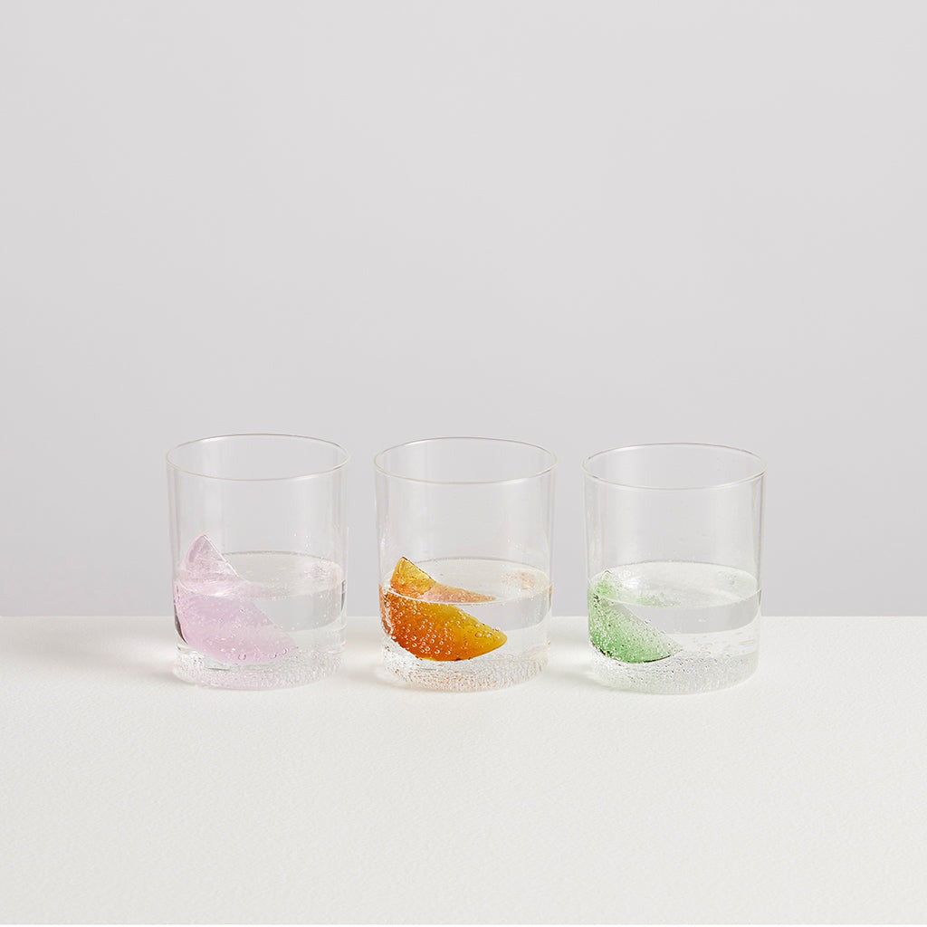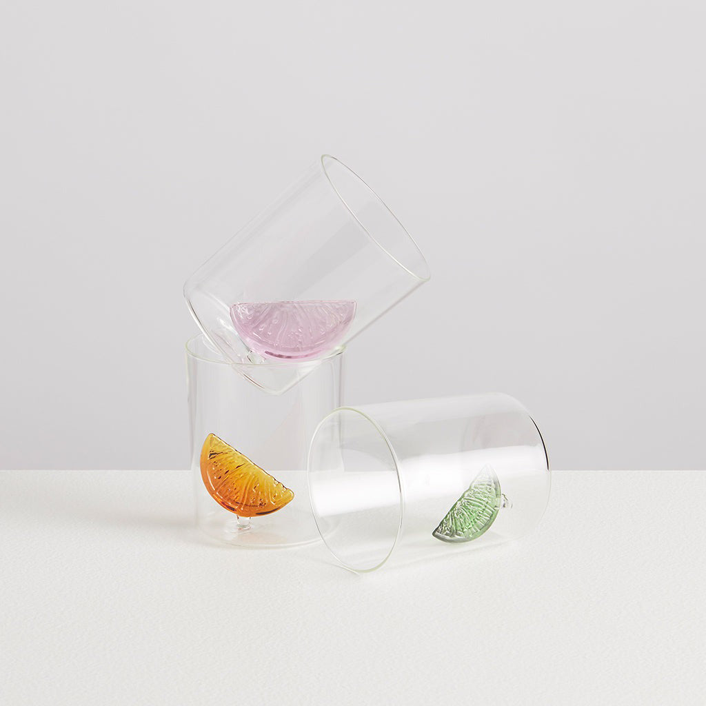 This set of three gobelets is always ready for a drink, no matter if you feel like a sparkling water, a mocktail or a gin & tonic! They each hold an everlasting glass citrus in their hearts, so whether you desire pink grapefruit, sweet orange or fresh lime; you'll never be caught without the essential finishing touch. This trio of glasses is part of our signature cocktail collection, created from a desire to invent playful yet practical drinking vessels.