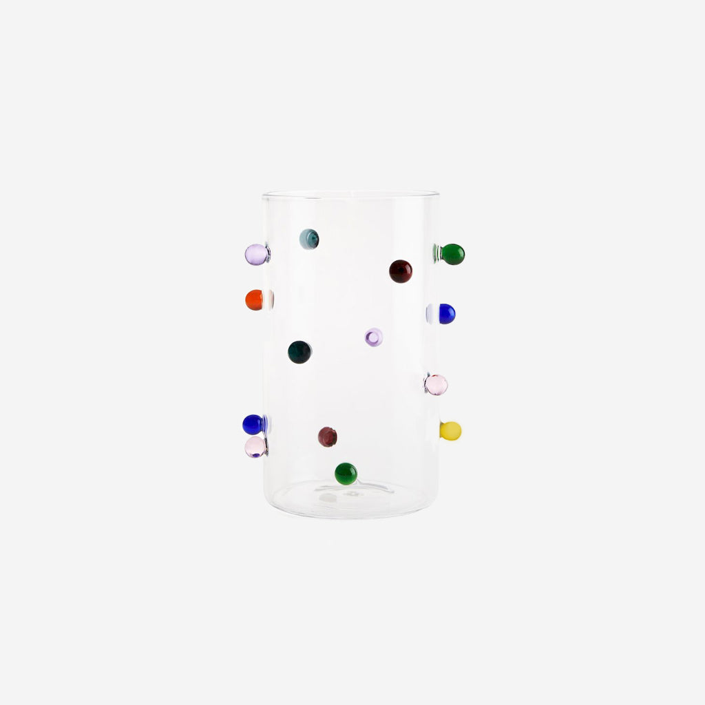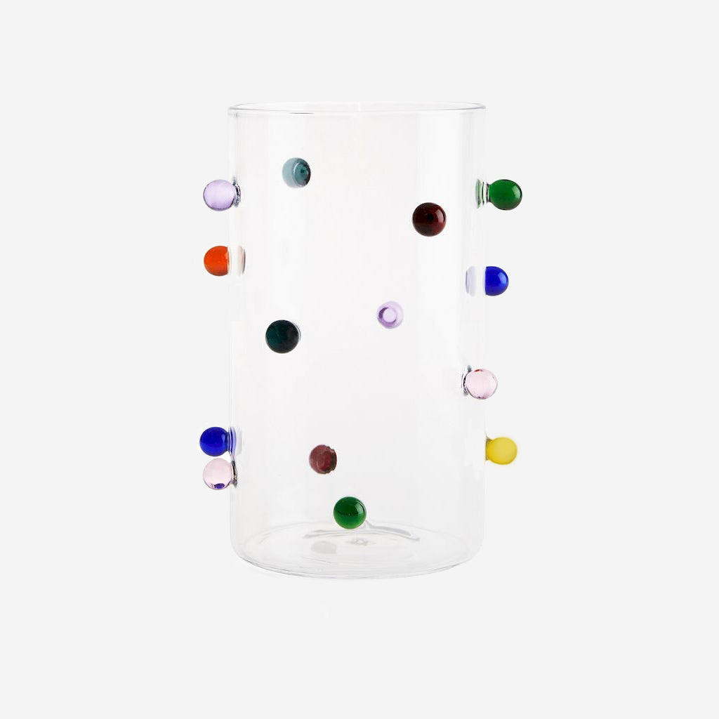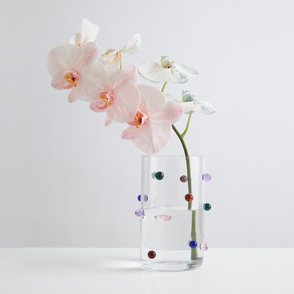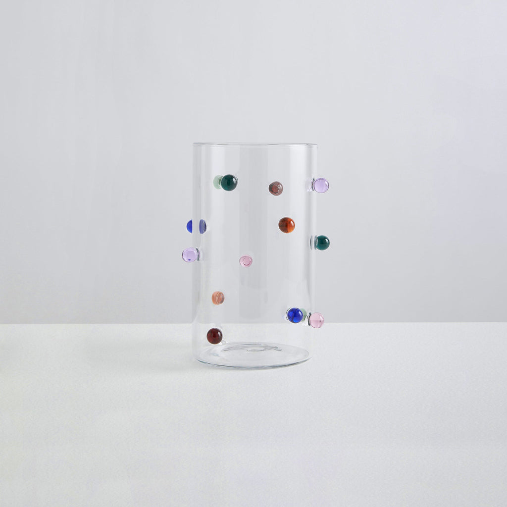 The Pomponette vase, in the clearest borosilicate glass and draped it in a cloak of jewel toned bubbles, is delicately hand made to proudly stand as a centrepiece of any tabletop. We encourage you to fill this vase with your favourite bouquet and imagine a world amongst a kelp forest.